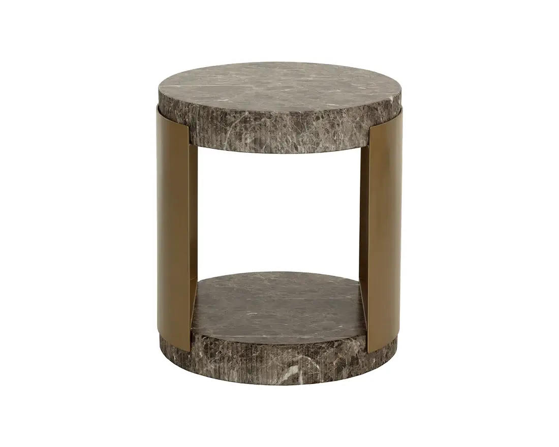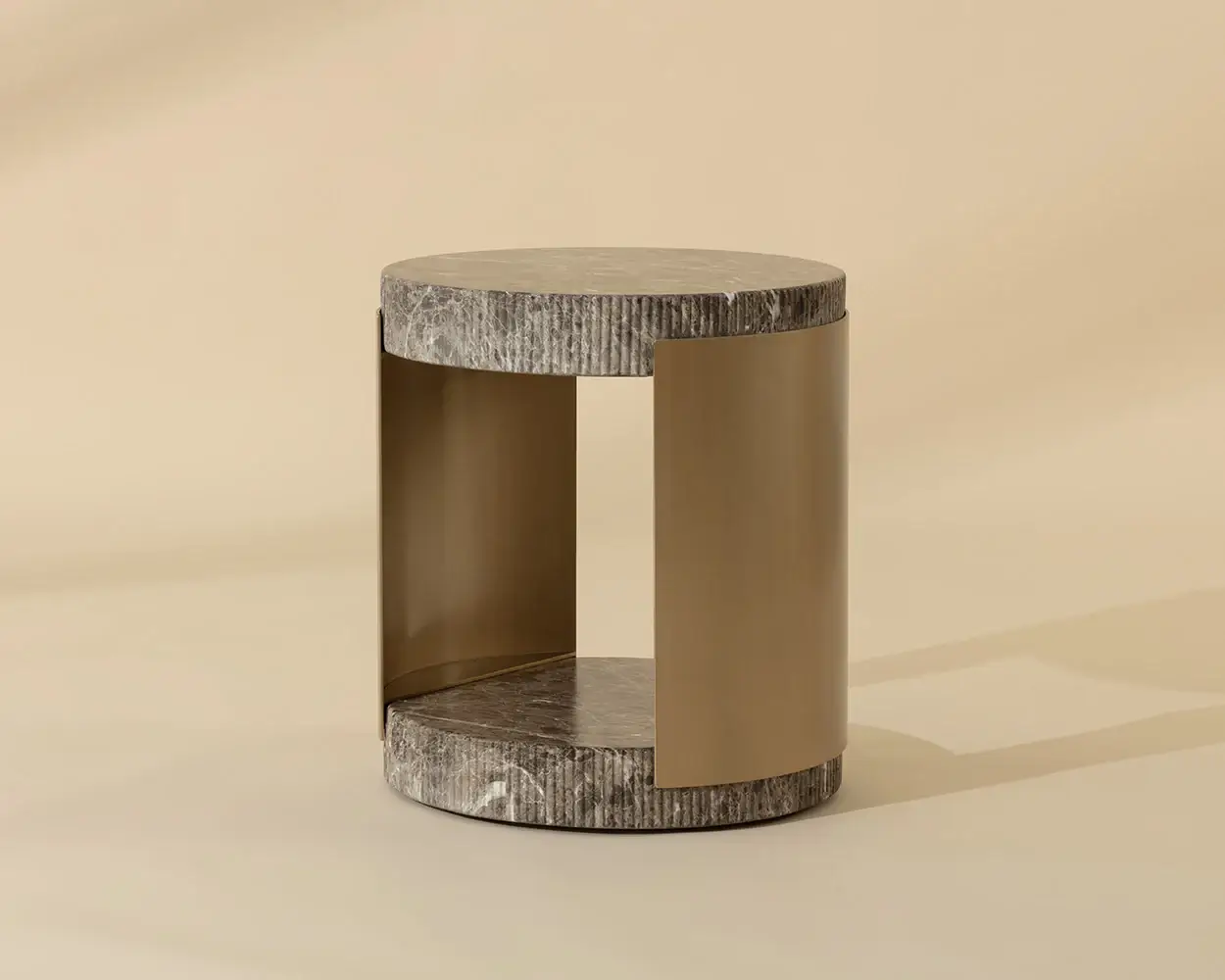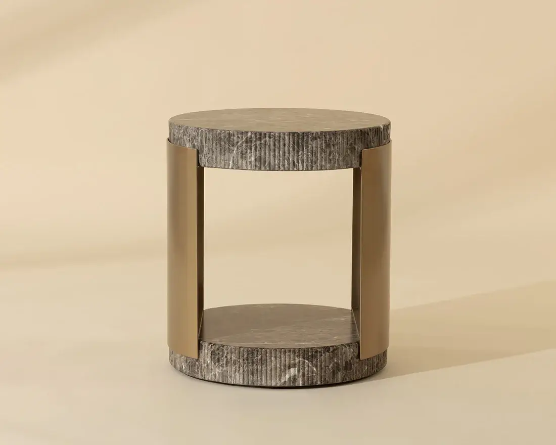 The Cavette End Table combines old world influence with feminine flair. Features a ridged concrete top and base in a dark emperador marble-like finish and completed with a brass steel frame.