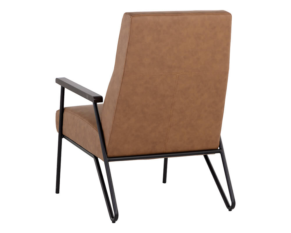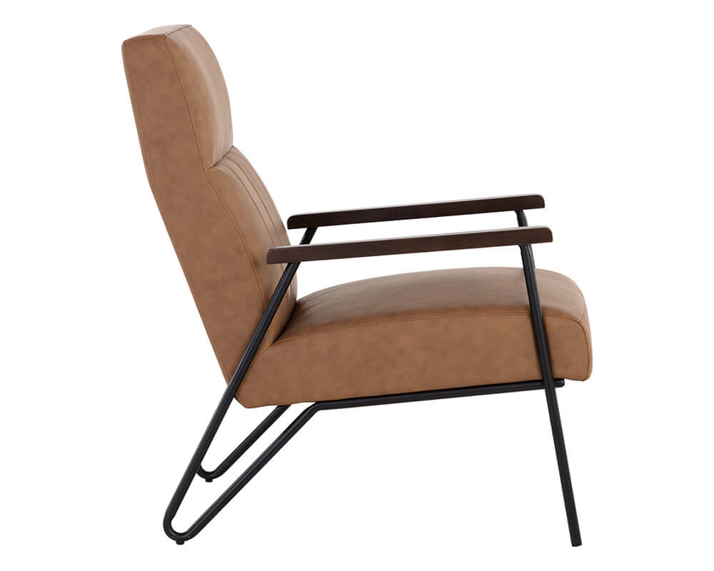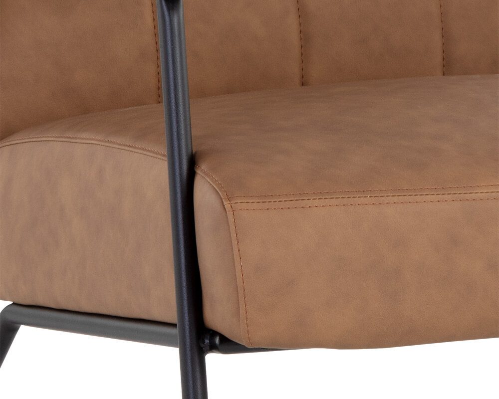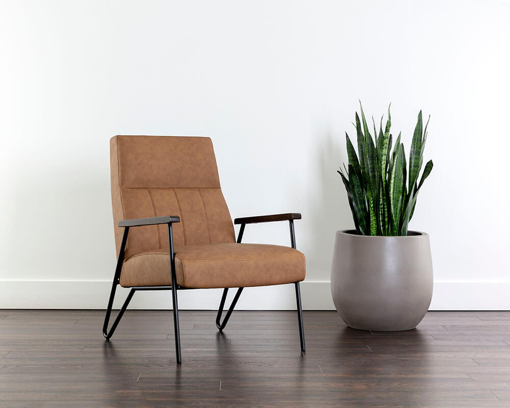 Inspired by mid-century modern design, this lounge chair is full of comfort and style. Upholstered in bounce nut and stone faux leathers with vertical tufting on the seat interior. Completed with a black powder coated steel base. Also available in light grey fabric. Handle With Care: This design has been crafted with faux leather. Faux leather is manufactured to reflect the natural characteristics of leather; as such, colour variations, markings wrinkles, grooves, and light scratches are appreciated characteristics. No two pieces will be alike.