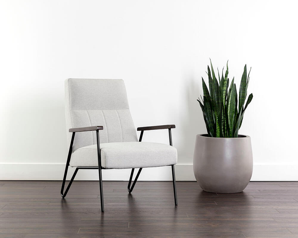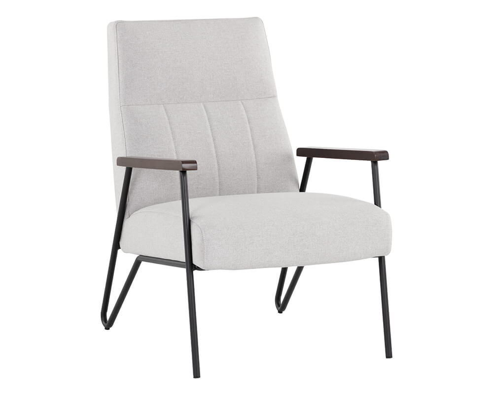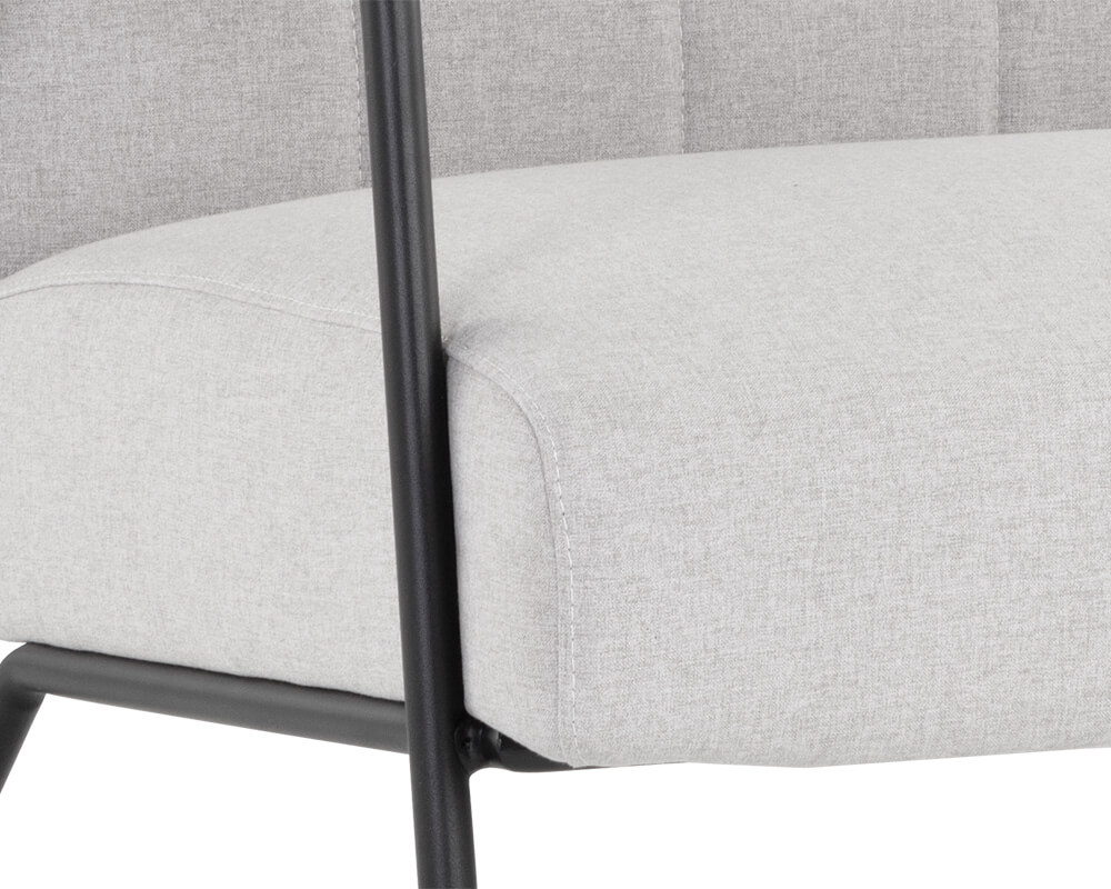 Inspired by mid-century modern design, this lounge chair is full of comfort and style. Upholstered in light grey fabric with vertical tufting on the seat interior. Completed with a black powder coated steel base. Also available in bounce nut and stone faux leathers.