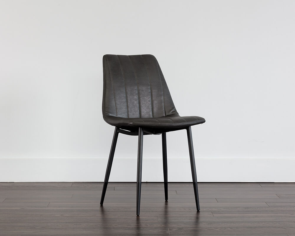 This compact dining chair creates a cool and casual mood. Features channel tufting on the seat and seatback. Stocked in bravo cognac or portabella faux leather, or light grey fabric with a black powder coated steel frame. Also available in antonio linen fabric with a brushed champagne gold steel frame. Handle With Care: This design has been crafted with faux leather. Faux leather is manufactured to reflect the natural characteristics of leather; as such, colour variations, markings, wrinkles, grooves, and light scratches are appreciated characteristics. No two pieces will be alike.