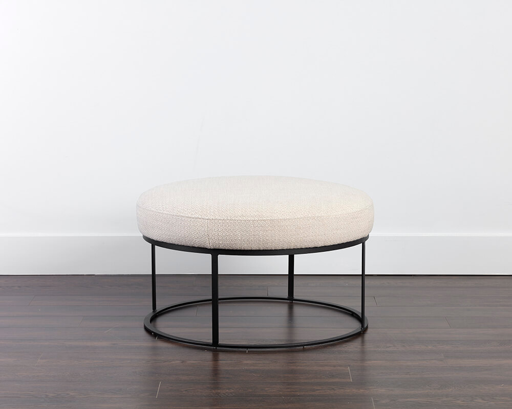 This round ottoman designed with modern elements will be the perfect additional seat or footrest in living and lounge spaces. Stocked in moto stucco fabric, and overcast grey or tobacco tan faux leather with a black iron frame.