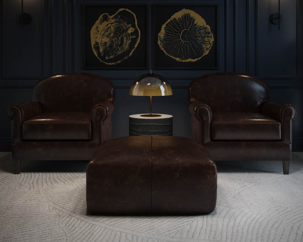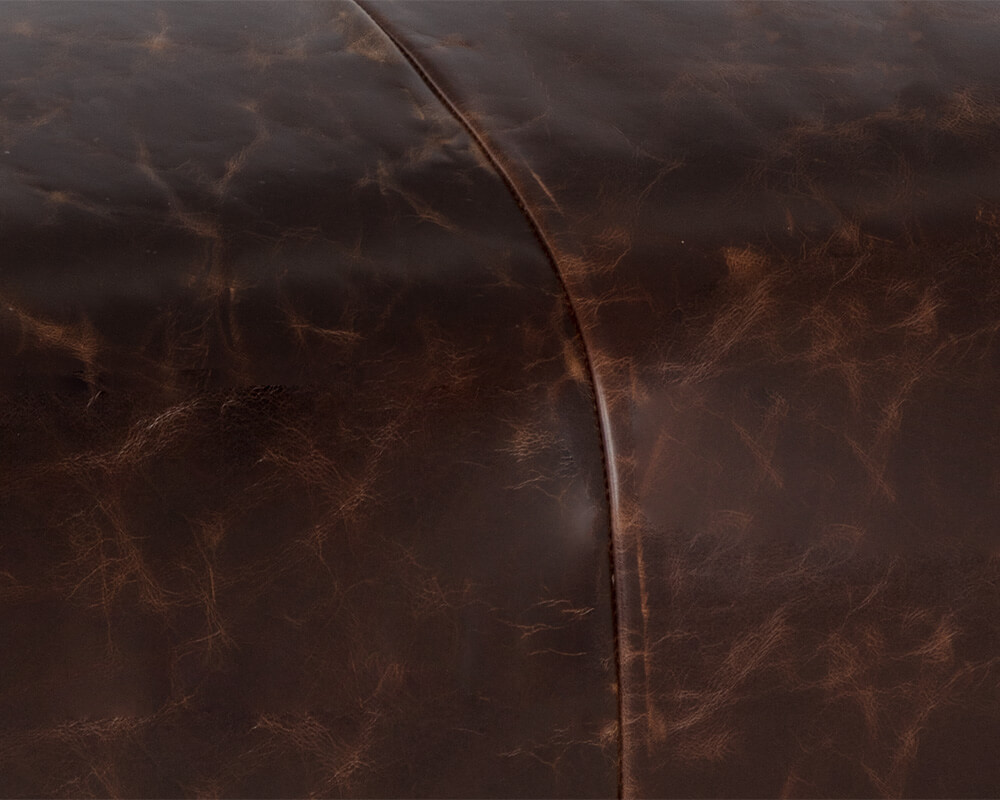 - Upholstered in pure aniline leather, treated with oil, and finished with wax