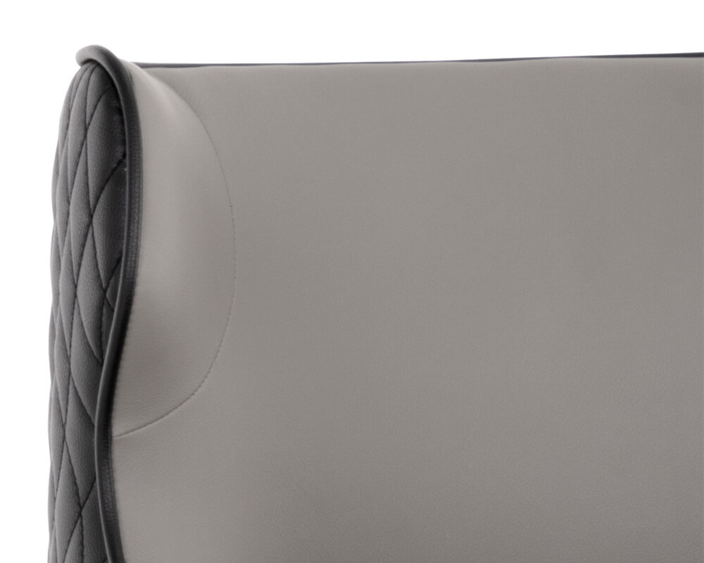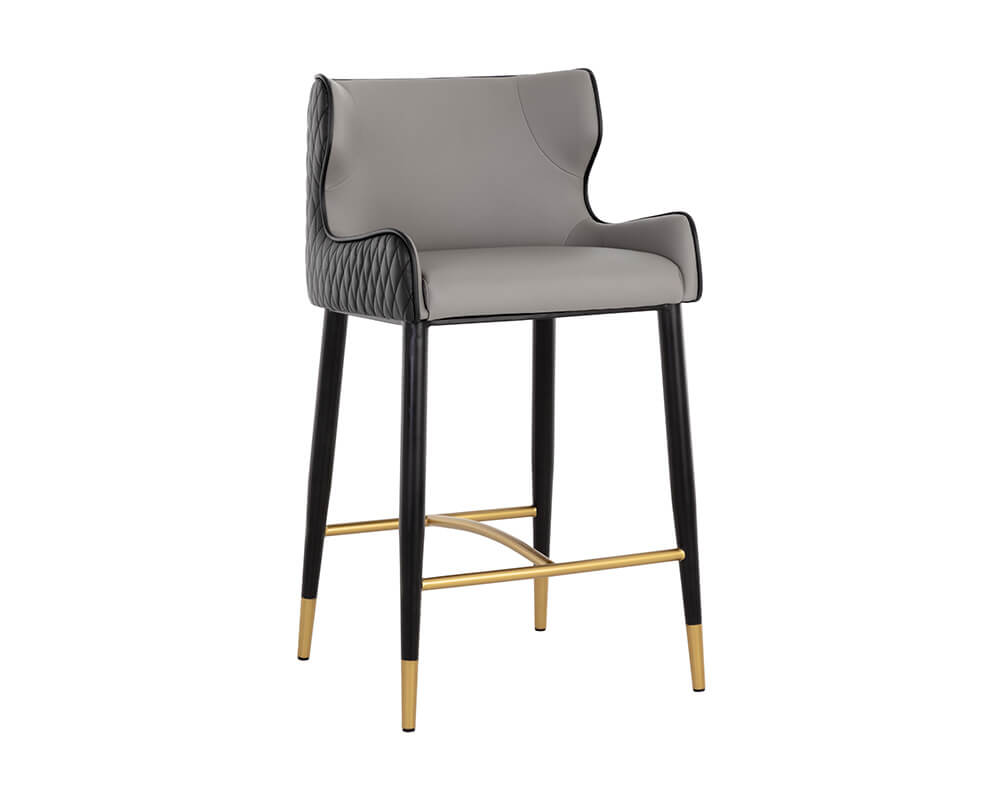 A classic counter stool featuring a substantial seat upholstered in contrasting dillon stratus and black faux leather. Diamond stitching on the seatback adds a hint of elegance while black wood legs and brushed gold foot caps complete the look. Handle With Care: This design has been crafted with faux leather. Faux leather is manufactured to reflect the natural characteristics of leather; as such, colour variations, markings, wrinkles, grooves, and light scratches are appreciated characteristics. No two pieces will be alike.