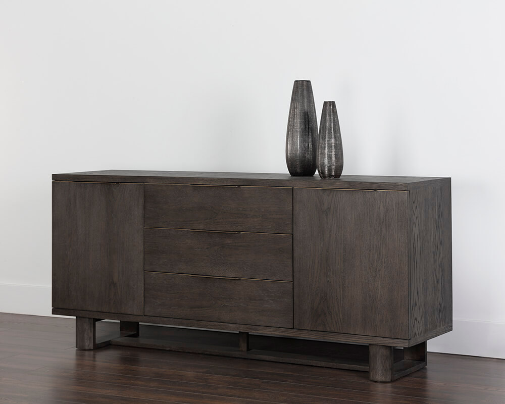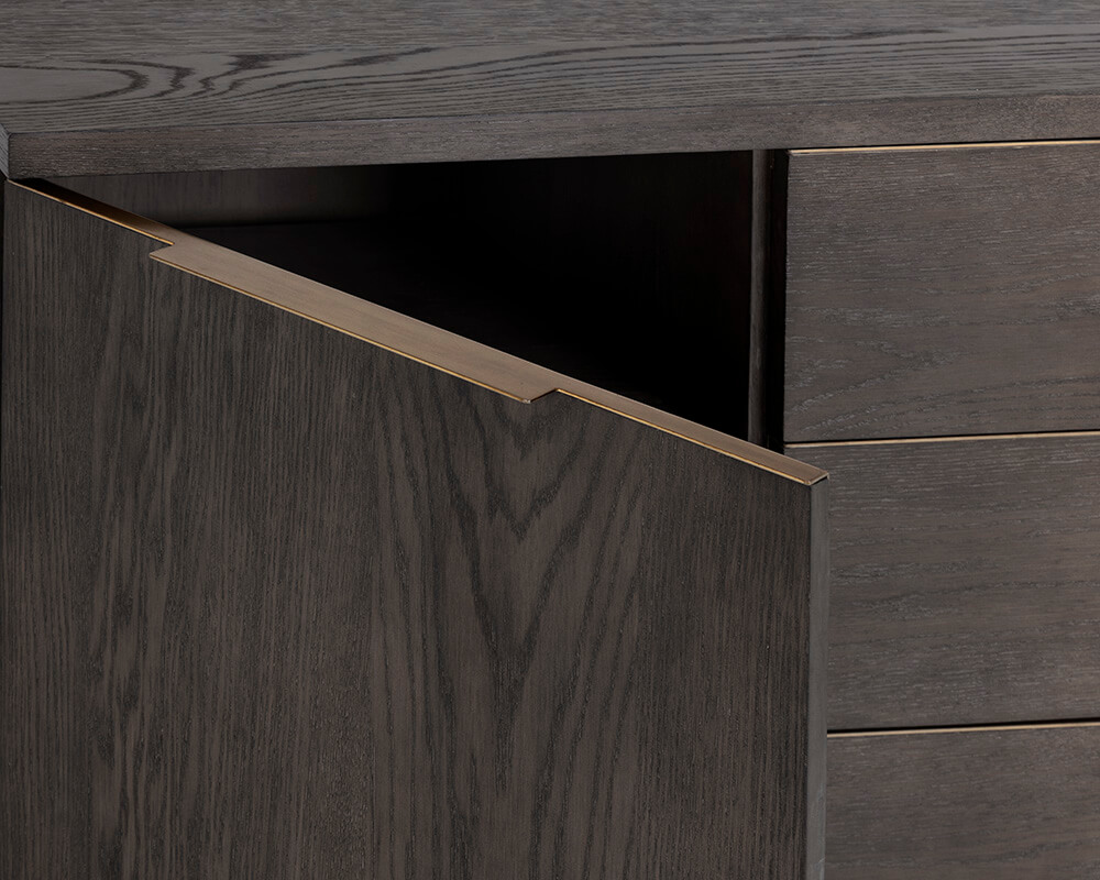 Form and function come together in this beautiful sideboard that features a stylish base for an elevated look. Crafted with a dark brown oak veneer and solid oak wood legs. Completed with antique silver iron handles. Pairs well with the Giulettia dining table in dark brown. Anti-tip kit included. As wood is an organic, porous material, these pieces will contain natural variation of texture and may also exhibit fine indentations and cracks. Wood pieces will also display a disparity of colour and grain, and visible knots and burls that add to the character of each piece.