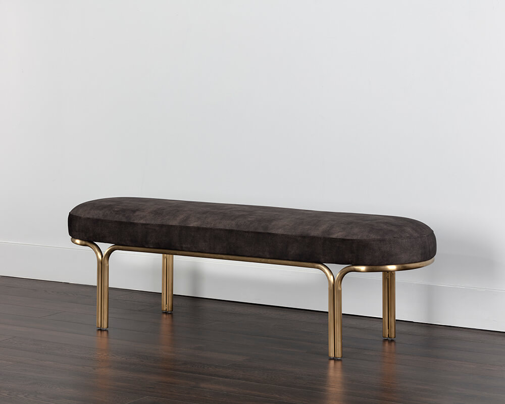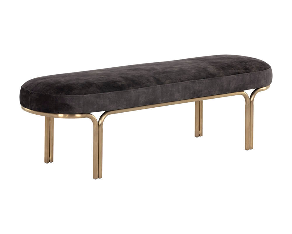 Boasting a classic oval shape, this elegant bench is a stylish and functional addition to any space. Stocked in nono shitake and cream fabrics, and completed with a gold iron frame.