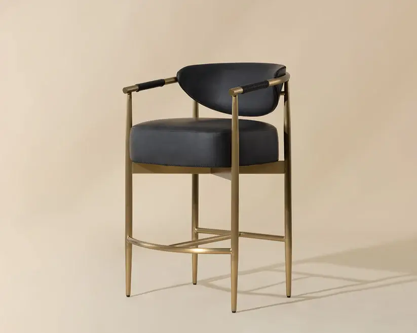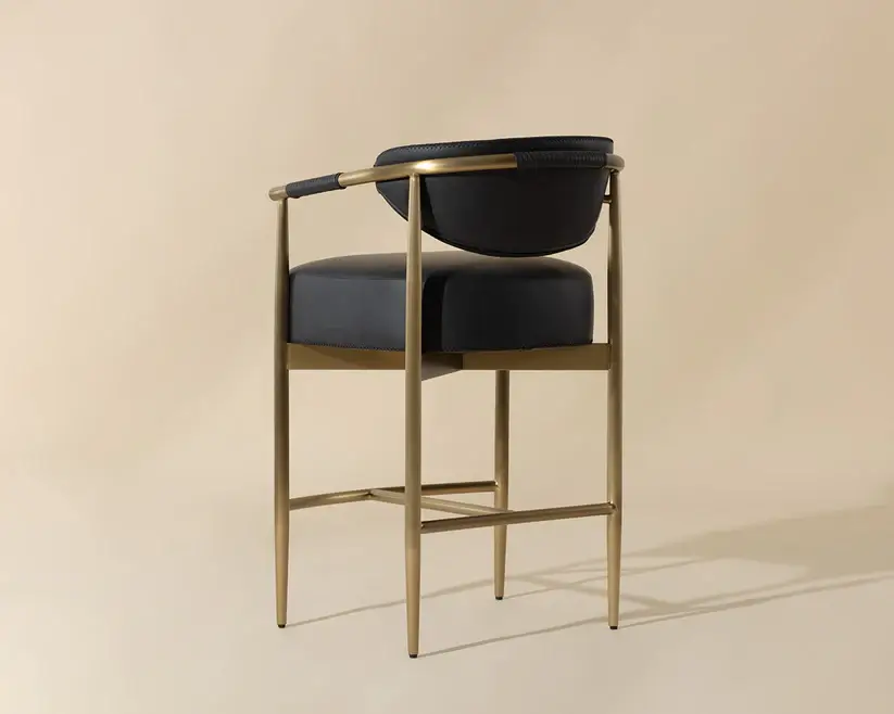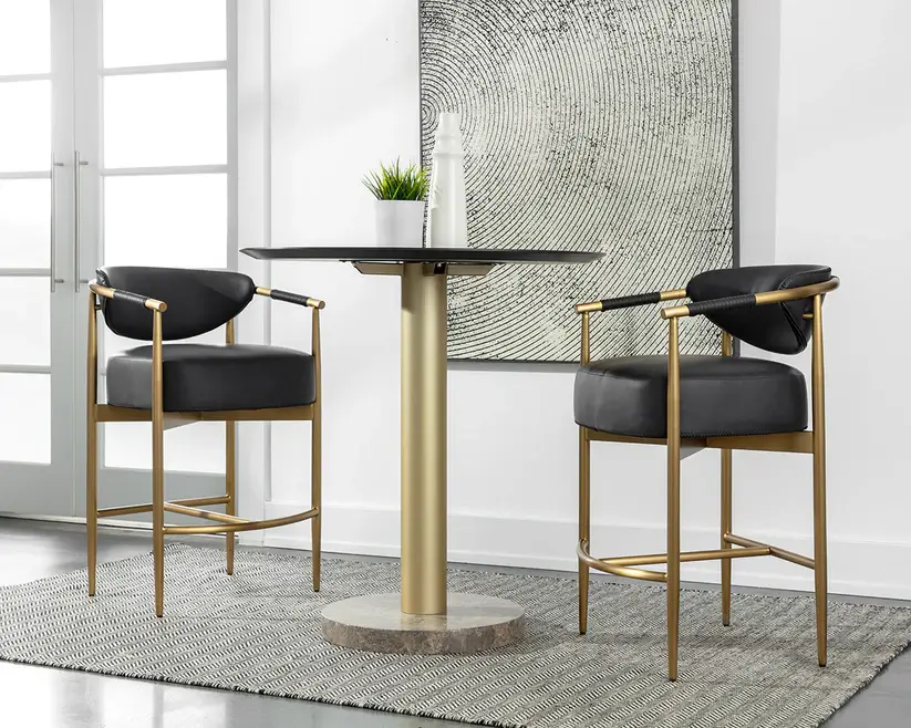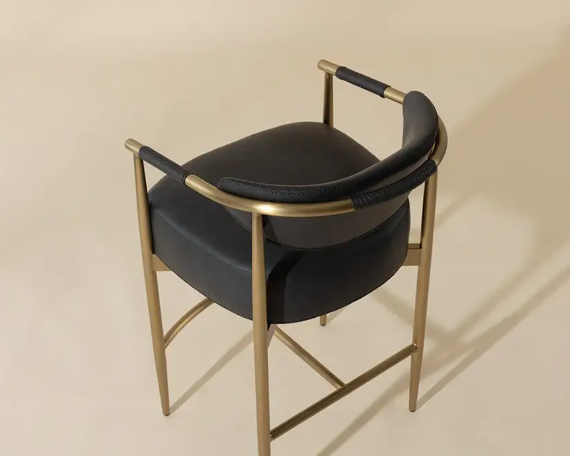 Every detail that makes up the handsome Heloise Counter Stool is designed with purpose. Bravo black faux leather upholstery and rope detailing is paired with powder-coated gold stainless steel for optimal style and comfort. Visible stitching on the seat and backrest accentuates the chair's smooth contours. This elegant barstool will perfectly complement any dining space. Handle With Care: This design has been crafted with faux leather. Faux leather is manufactured to reflect the natural characteristics of leather; as such, colour variations, markings, wrinkles, grooves, and light scratches are appreciated characteristics. No two pieces will be alike.