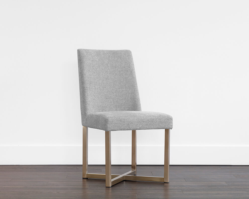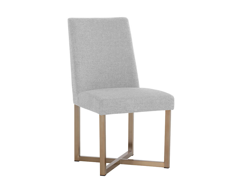 This modern dining chair features a stainless steel x-base in an antique brass finish and is stocked in belfast heather grey and koala grey fabrics. Also available in black, grey and white faux leathers in a silver finish.