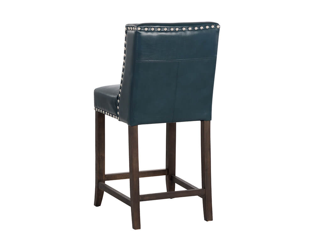The timeless structure of this counter stool makes it an instant classic for any dining or kitchen space. With a stylish nailhead trim, this chair is upholstered in cantina petrol bonded leather and completed with dark brown rubberwood legs. Also available in kais zebra fabric. Handle with Care: This design has been crafted with bonded leather. Bonded leather is a blend of reconstituted leather and synthetic materials crafted to reflect the natural characteristics of leather; as such, colour variations, markings, wrinkles, grooves and light scratches are acceptable and appreciated characteristics. No two pieces are alike.
