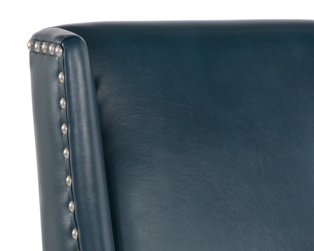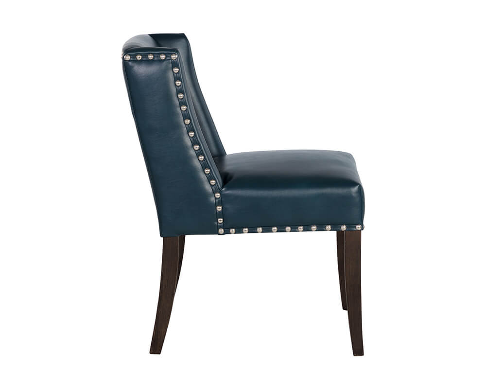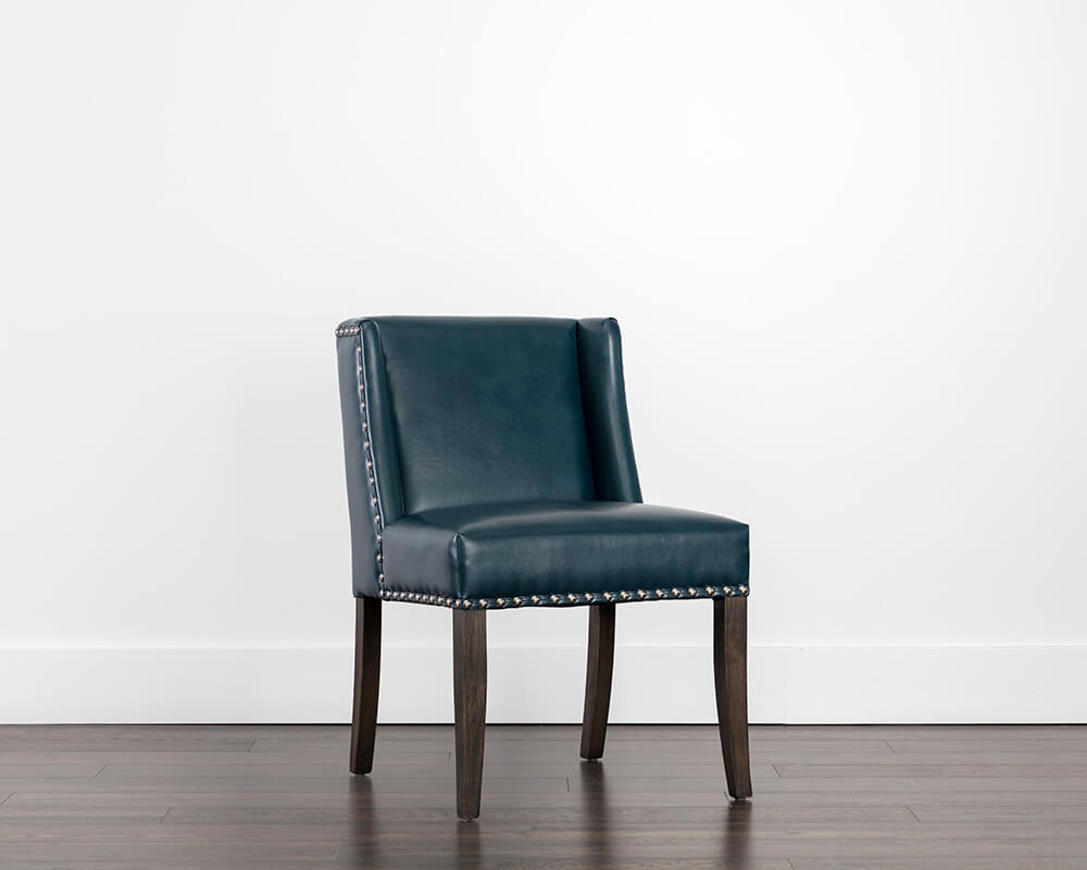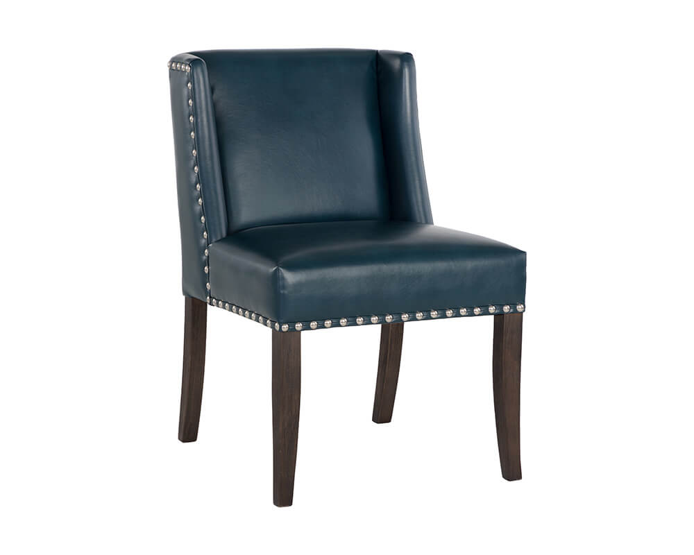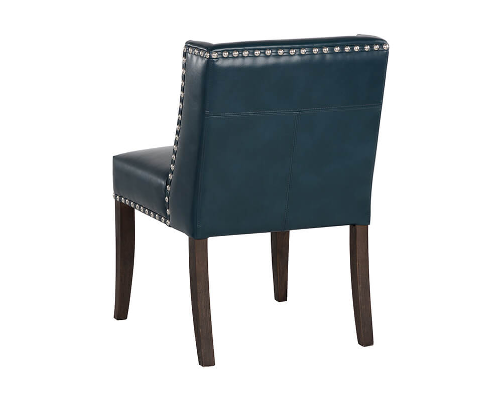 The timeless structure of this dining chair makes it an instant classic for any dining room space. With a stylish nailhead trim, this chair is upholstered in cantina petrol bonded leather and completed with dark brown rubberwood legs. Also available in kais zebra fabric.