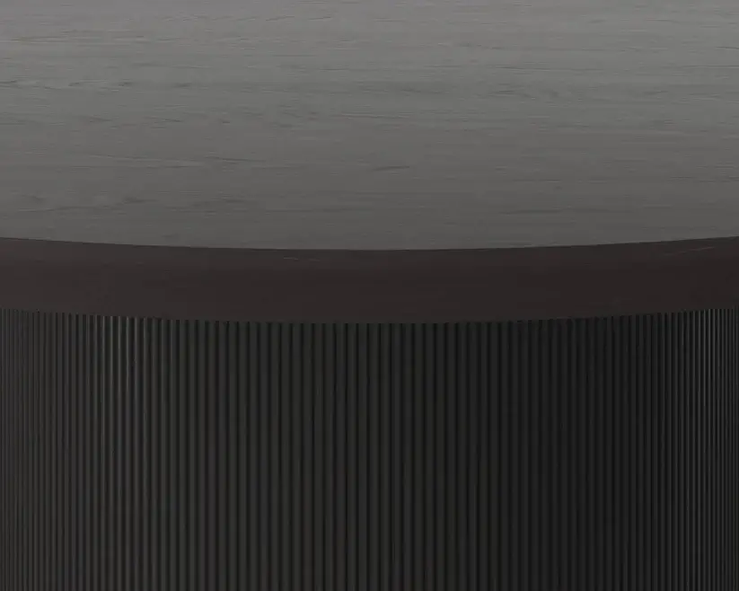 The Kalla Dining Table brings form and function to life. Crafted with a charcoal grey oak veneer table top with a chamfered edge. Vertical reeding on a solid oak wood base with brushed gold steel detailing at the bottom finishes the look. As wood is an organic, porous material, these pieces will contain natural variation of texture and may also exhibit fine indentations and cracks. Wood pieces will also display a disparity of colour and grain, and visible knots and burls that add to the character of each piece.