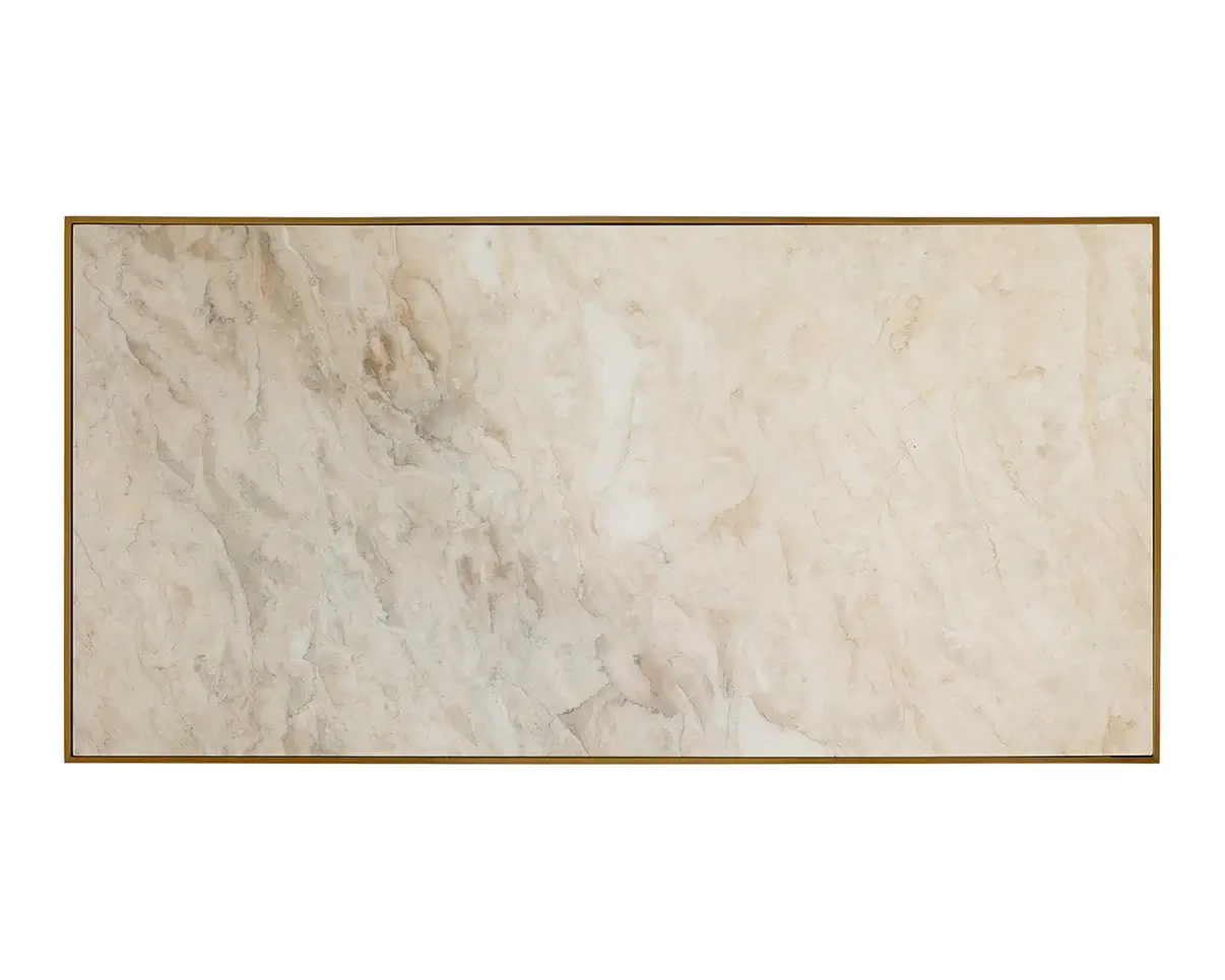 Warm tones and sleek modern lines define the Kamali Coffee Table. The beige rectangular marble tabletop is beautifully outlined by an antique gold powder coated stainless steel base. It's the perfect addition to any living space. Side table version also available. As marble is a natural material, unique veining, pitting, fissures, micro-cracks and colour variations are all characteristics that add to the uniqueness and beauty of each piece.