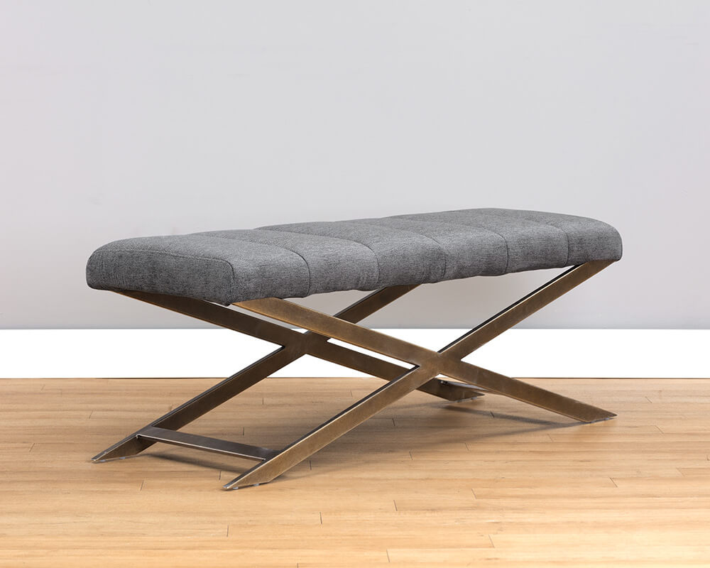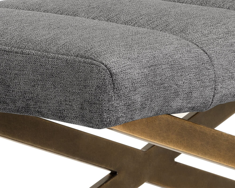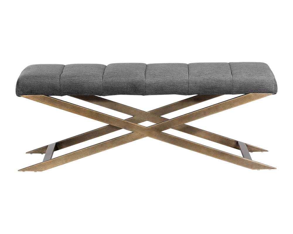 An elegant bench designed with modern warmth. Designed with channel tufting and an antique brass x-base. Available in polo club kohl grey or muslin performance fabric and bravo cream or metal faux leather. Performance fabric is moisture repellent, stain resistant and easy to clean.