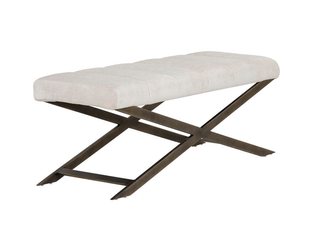 An elegant bench designed with modern warmth. Designed with channel tufting and an antique brass x-base. Available in polo club kohl grey or muslin performance fabric and bravo cream or metal faux leather. Performance fabric is moisture repellent, stain resistant and easy to clean.
