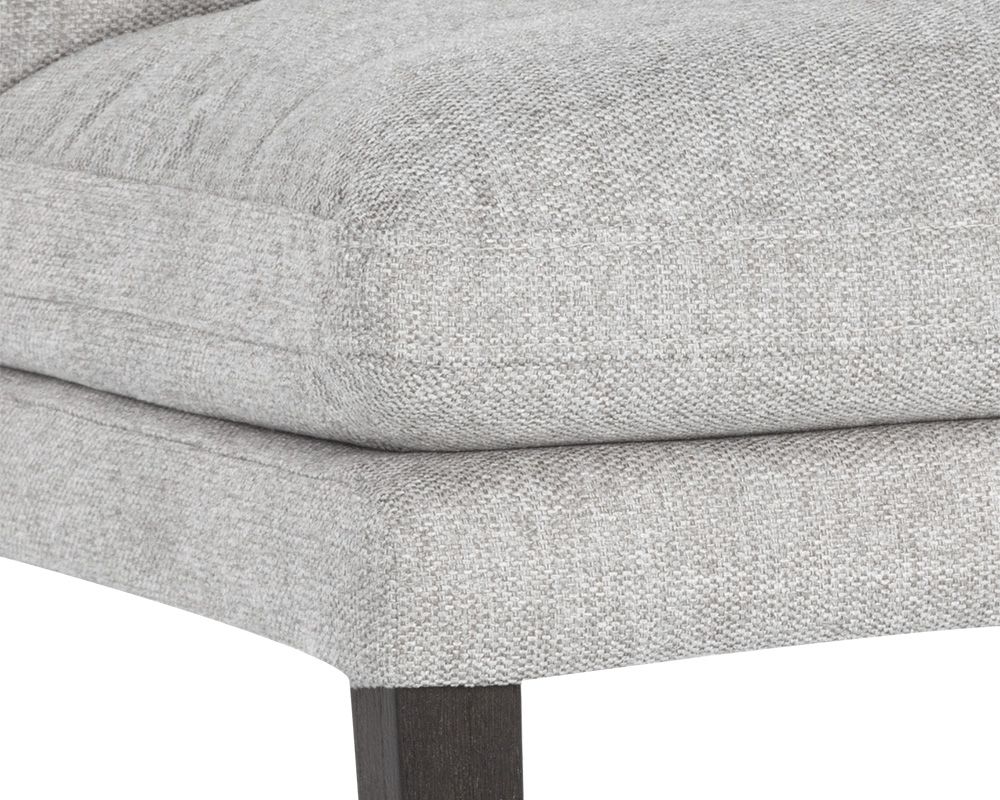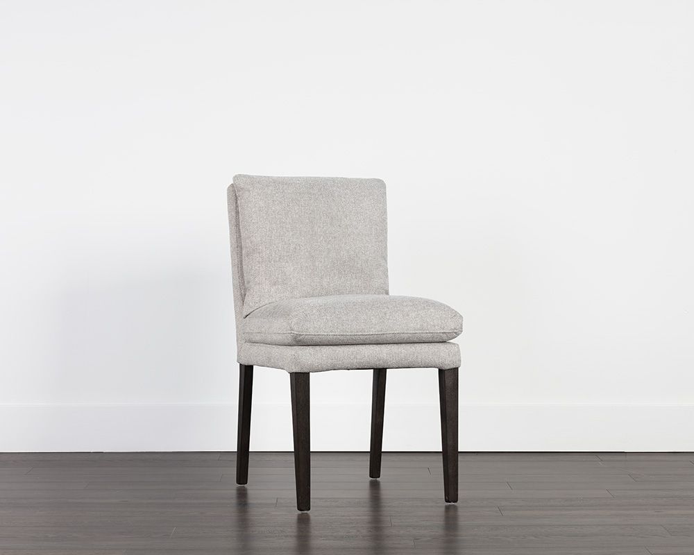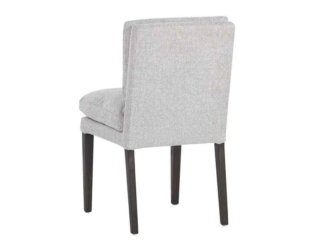- A modern dining chair that features a generously cushioned backrest and seat for a comfortable dining experience. Upholstered in belfast heather grey fabric and completed with espresso birch wood legs. Also available in belfast koala grey fabric with dark brown legs.
