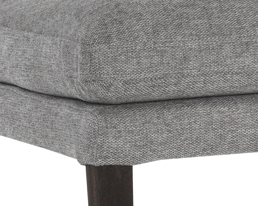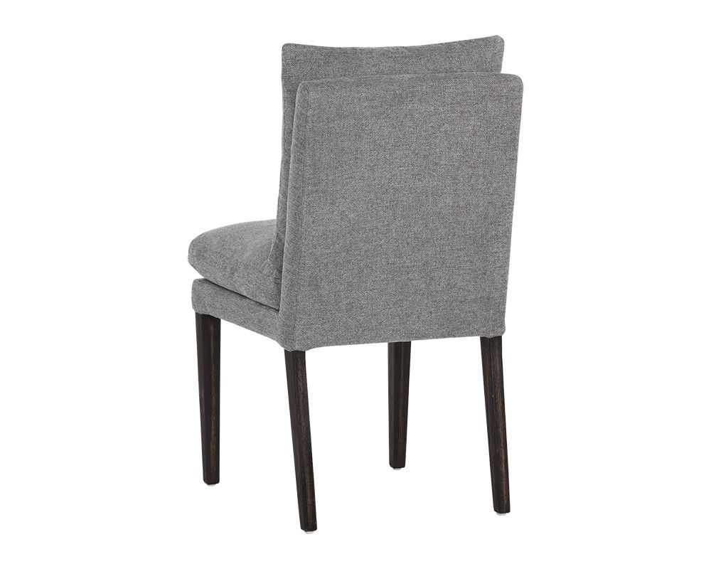 A modern dining chair that features a generously cushioned backrest and seat for a comfortable dining experience. Upholstered in belfast koala grey fabric and completed with dark brown birch wood legs. Also available in belfast heather grey fabric with espresso legs.