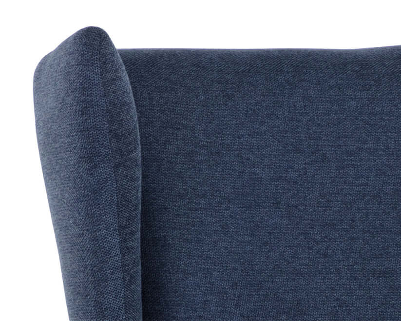 Elevate any space with this contemporary lounge chair that has a marvelous wingback design. Stocked in belfast navy and heather grey fabrics with subtle horizontal tufting on the interior seat. Completed with matte black powder coated steel frame and legs.