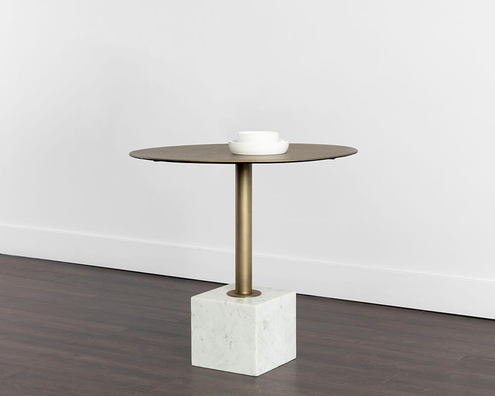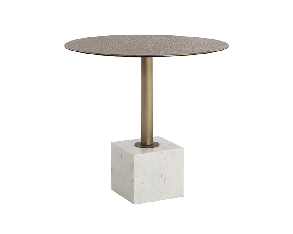 Add a touch of opulence to any space with this spectacular bistro table. Features a brushed antique brass frame with linear patterning on the tabletop. Completed with a white marble block base. Also available in grey marble. Made in India. With refined craftsmanship, this design was brought to life by skilled local artisans. By nature, these materials develop unique imperfections such as fissures, markings and colour variations for a truly one-of-a-kind piece.