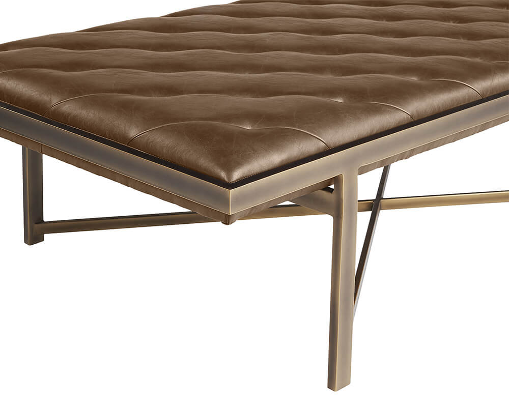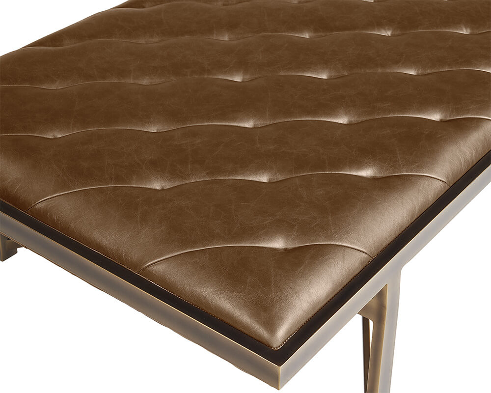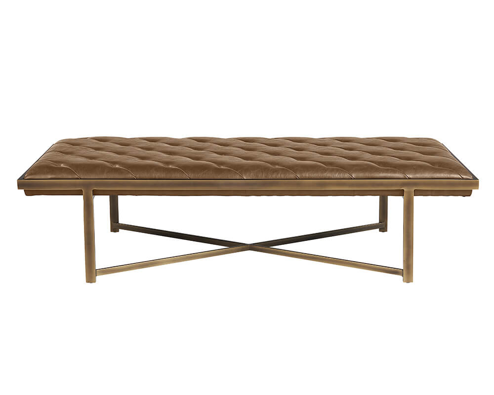 This large bench exudes opulent transitional style. Features diagonal tufting with an exposed x-base frame. Stocked in vintage cognac faux leather with an antique brass frame. Can be used as a daybed, coffee table or as extra seating in residential and commercial spaces. Handle With Care: This design has been crafted with faux leather. Faux leather is manufactured to reflect the natural characteristics of leather; as such, markings, wrinkles, grooves, and light scratches are appreciated characteristics. No two pieces will be alike. Visit our Product Care page for more information on how to ensure the lasting beauty of this piece.