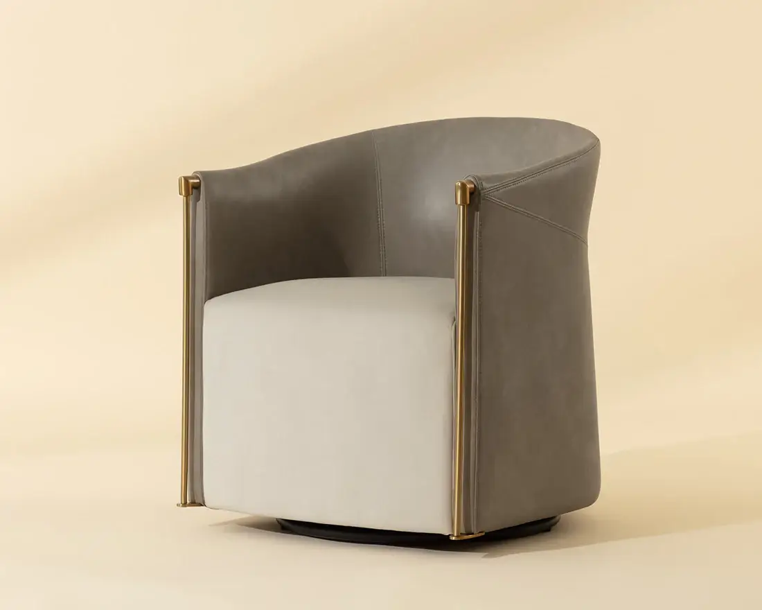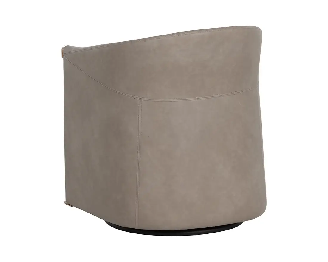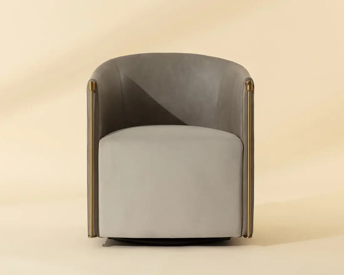 The Leontine Swivel Lounge Chair features a barrel-back design wrapped in smooth ivanhoe mineral faux leather, with exposed stitching accentuating gentle curves and enveloping comfort. A soft meg taupe fabric seat cushion gives the seat a tonal contrast, while slim powder-coated stainless steel arms bring a crisp, modern line to the silhouette. A composed yet effortless addition to a living or dining space.