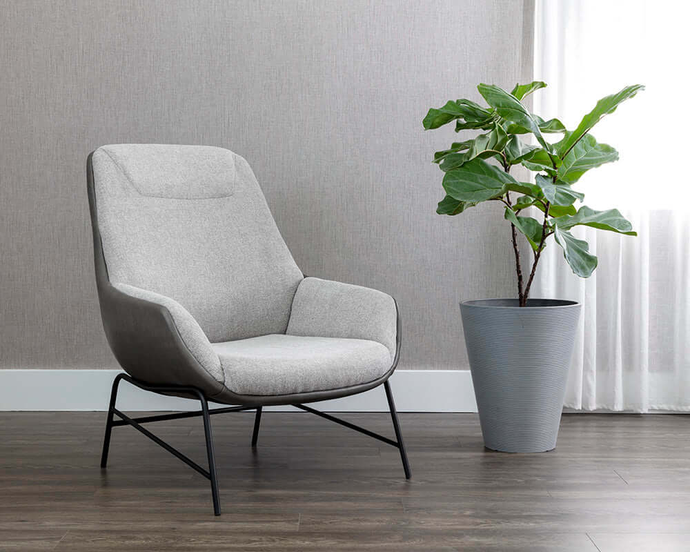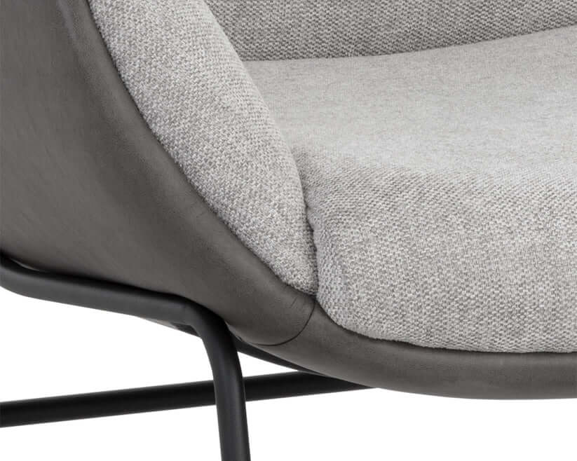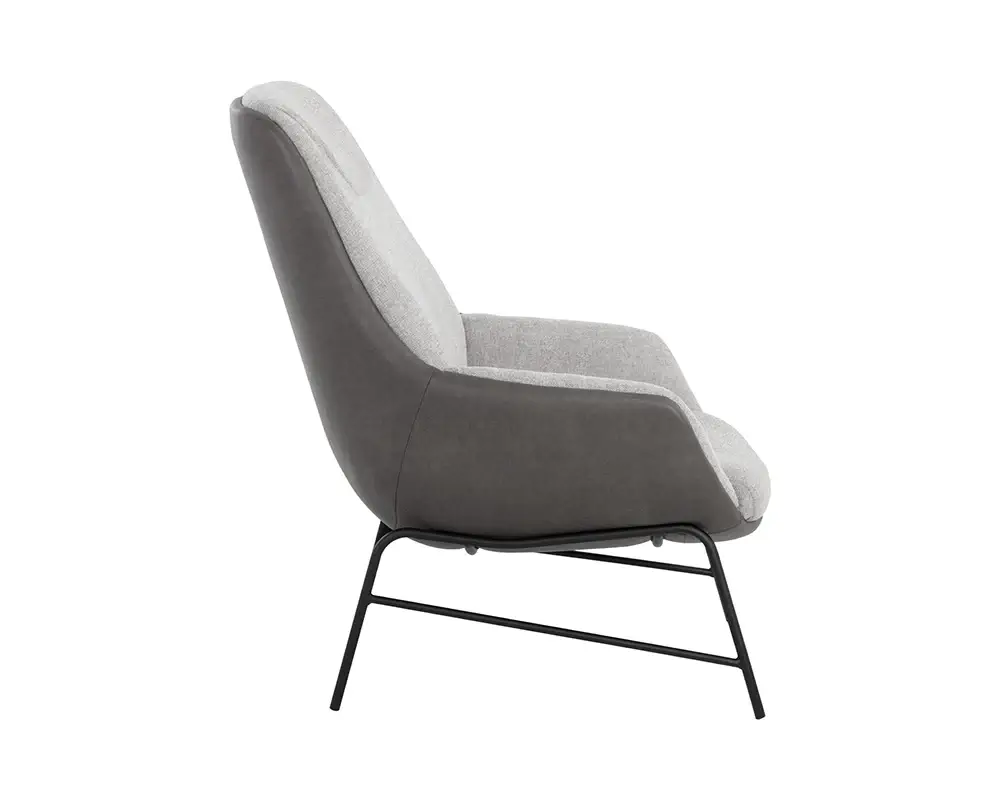 This handsome lounge chair is defined by modern design elements. Features a comfortable seat in belfast heather grey fabric with a bravo ash faux leather exterior. Black powder coated metal legs complete the look. Also available in belfast oatmeal fabric with bravo cognac faux leather. Handle With Care: This design has been crafted with faux leather. Faux leather is manufactured to reflect the natural characteristics of leather; as such, colour variations, markings wrinkles, grooves, and light scratches are appreciated characteristics. No two pieces will be alike.