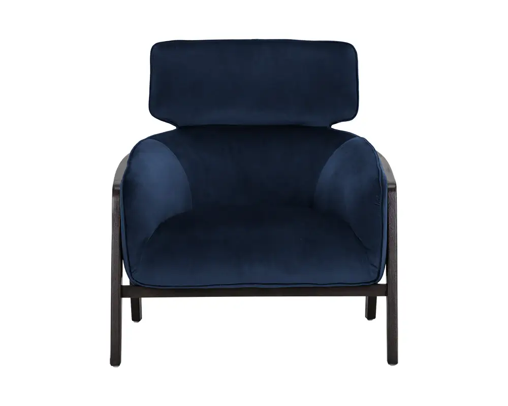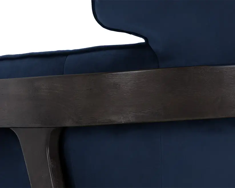 A masculine lounge chair that combines modern design elements with contemporary finishes. Stocked in moss green and metropolis blue fabric or with contrasting polo club stone fabric and overcast grey faux leather. A sculpted exposed brown wood frame completes the look.