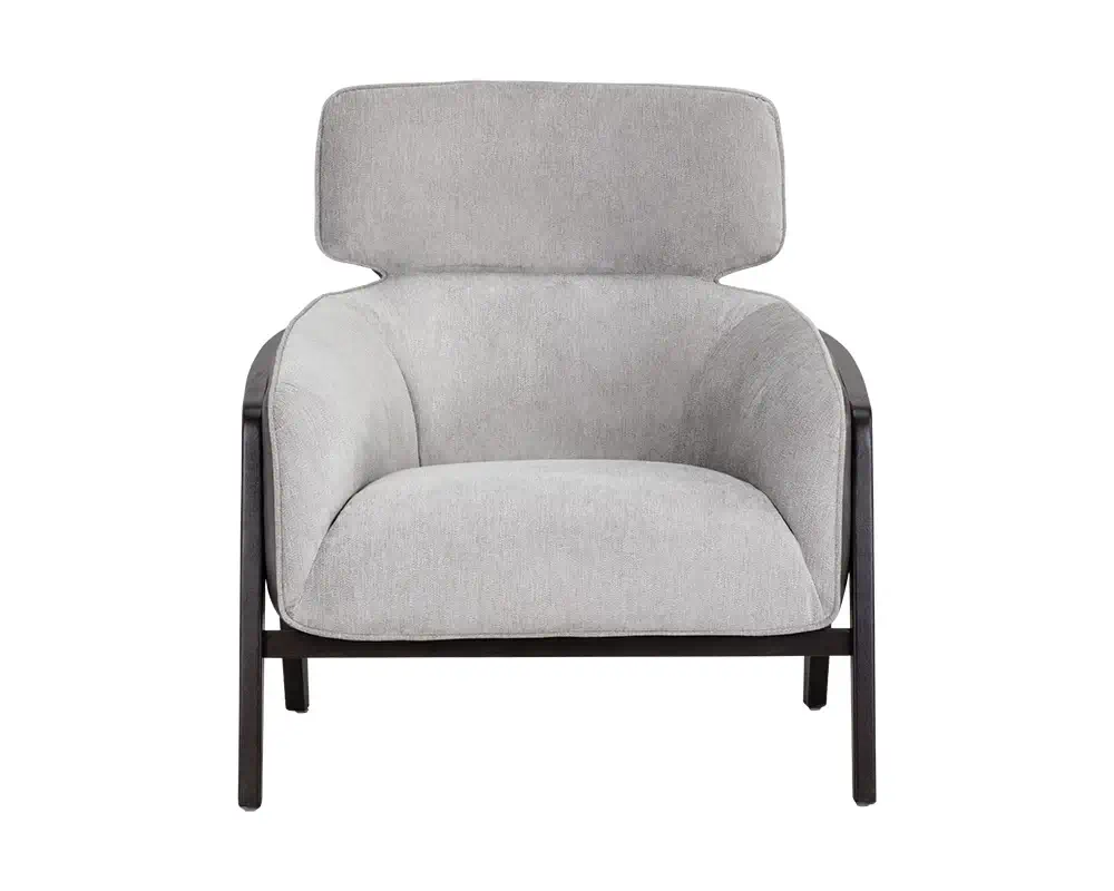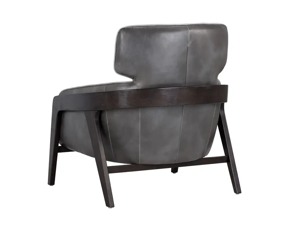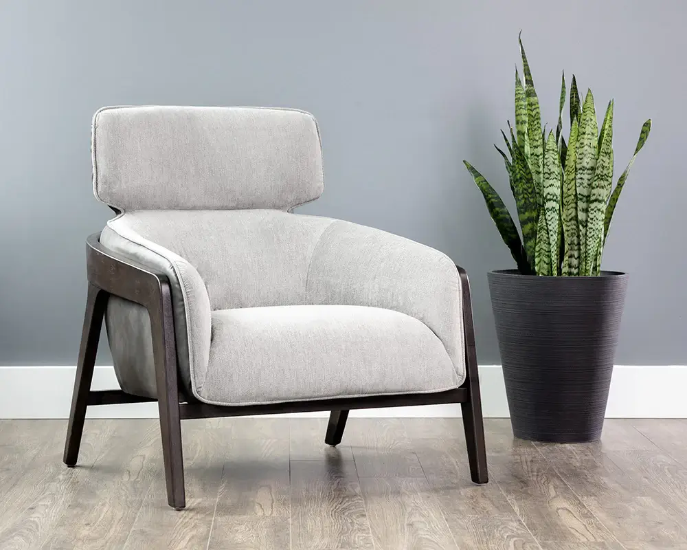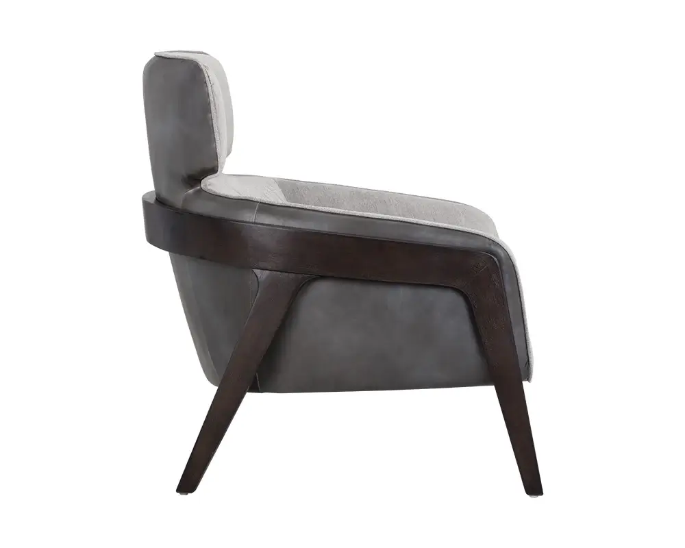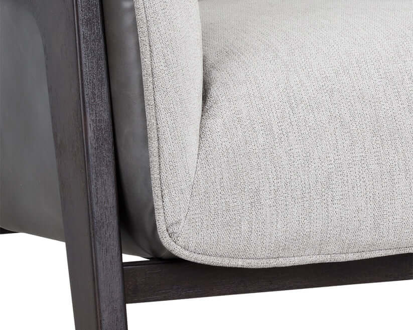 A masculine lounge chair that combines modern design elements with contemporary finishes. Stocked in contrasting polo club stone fabric and overcast grey faux leather. A sculpted exposed brown wood frame completes the look. Handle With Care: This design has been crafted with faux leather. Faux leather is manufactured to reflect the natural characteristics of leather; as such, colour variations, markings, wrinkles, grooves, and light scratches are appreciated characteristics. No two pieces will be alike.