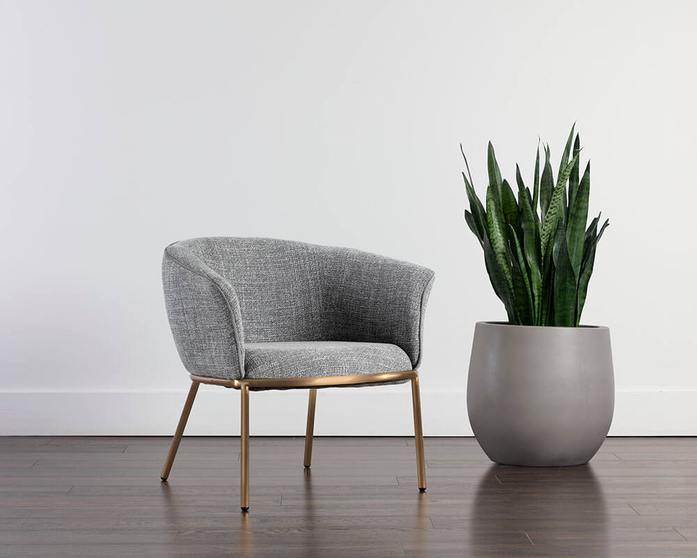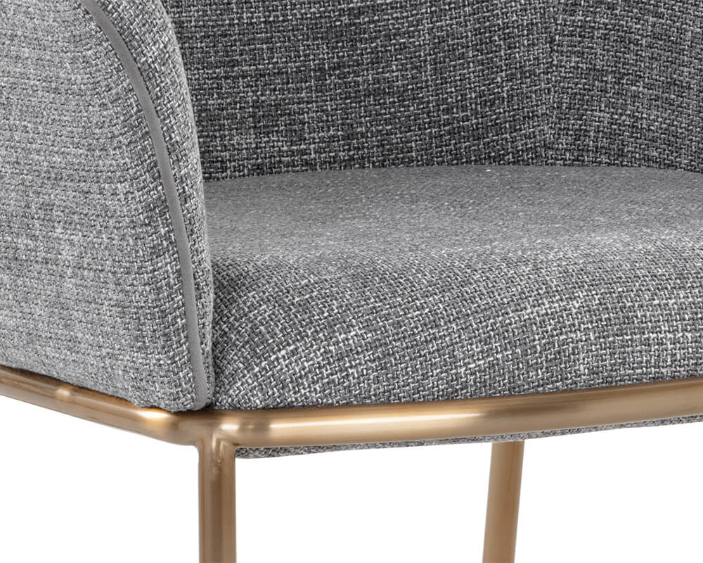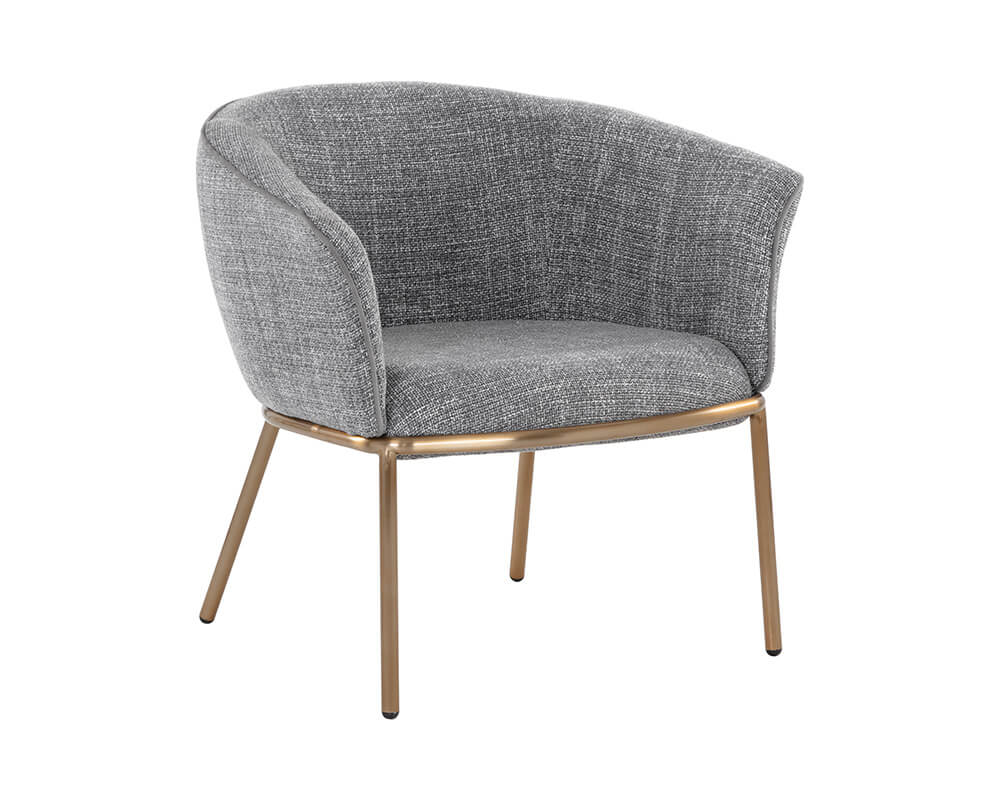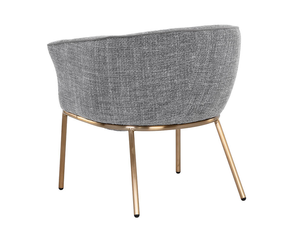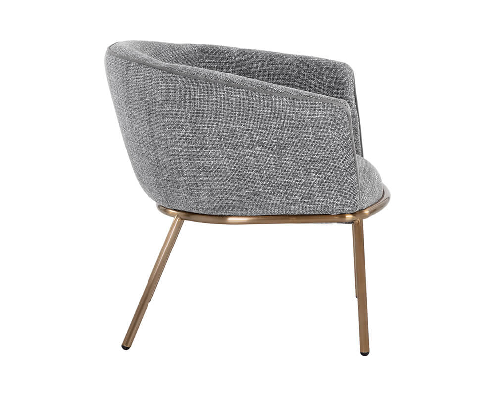A charming and well-defined lounge chair that features a beautiful barrel back shape for a comfortable lounging experience. Stocked in chacha grey fabric with contrast piping in antonio charcoal fabric. Completed with stainless steel legs in a gold finish. Also available in chacha navy fabric with contrast piping in abbington navy fabric.