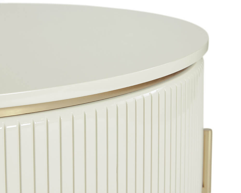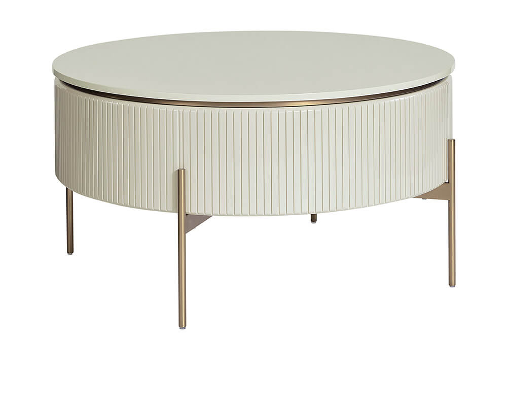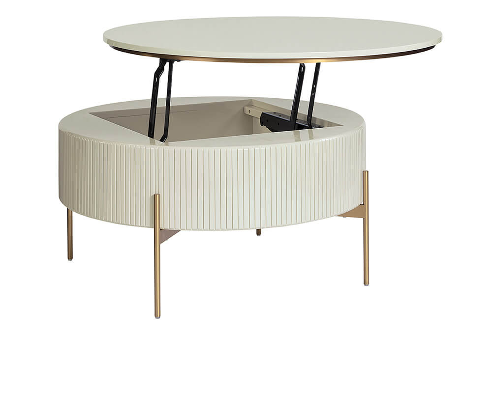 This luxurious lift-top coffee table will bring a sculptural spirit to any space. The curved frame, finished in high gloss cream, is contrasted with intricate vertical reeding. Gold stainless steel legs and inlay create added definition. Coordinating end table and sideboard also available.