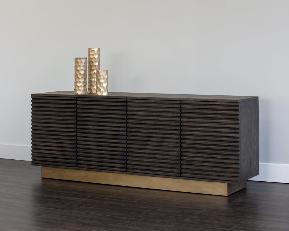 This beautifully crafted sideboard will add allure to any dining space. Designed with four large paneled cabinet doors and shelving for ample storage. An antique brass steel base completes the look. Distressed finish will have visible cracks and dents are part of the finish.
