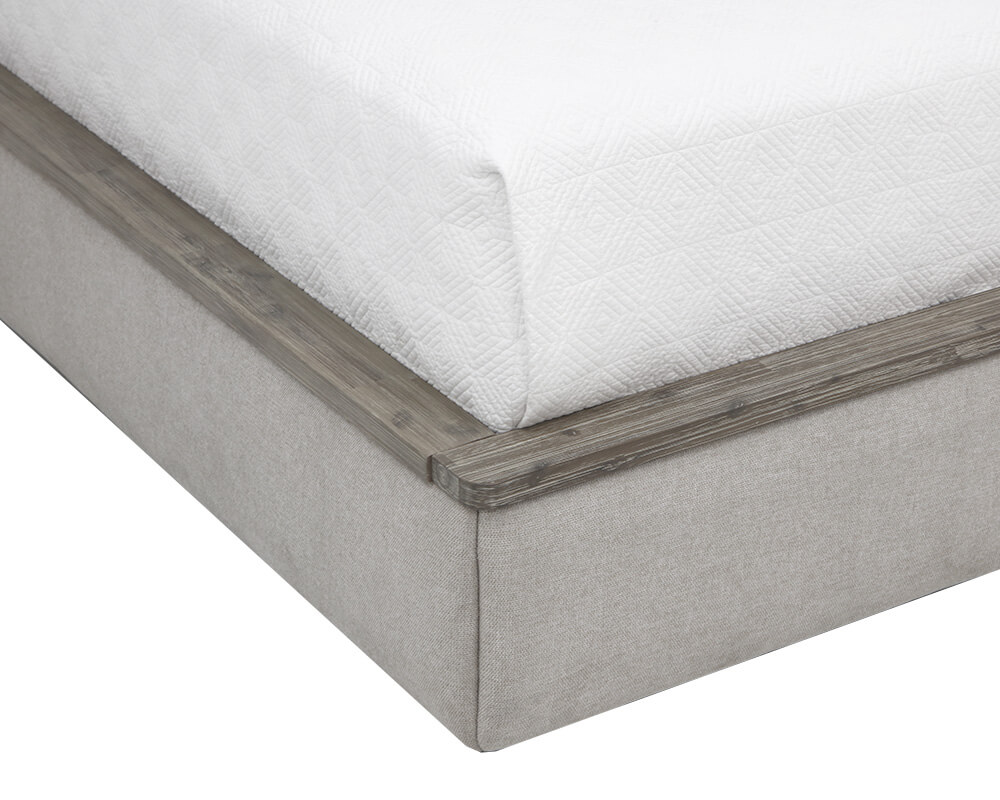 Slumber in style with this modern bed that features a charming design. Upholstered in our belfast heather oatmeal fabric and complemented with a brown solid acacia wood exposed frame in a brushed white ceruse finish. No box spring is required and slats are included.
