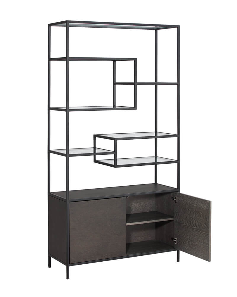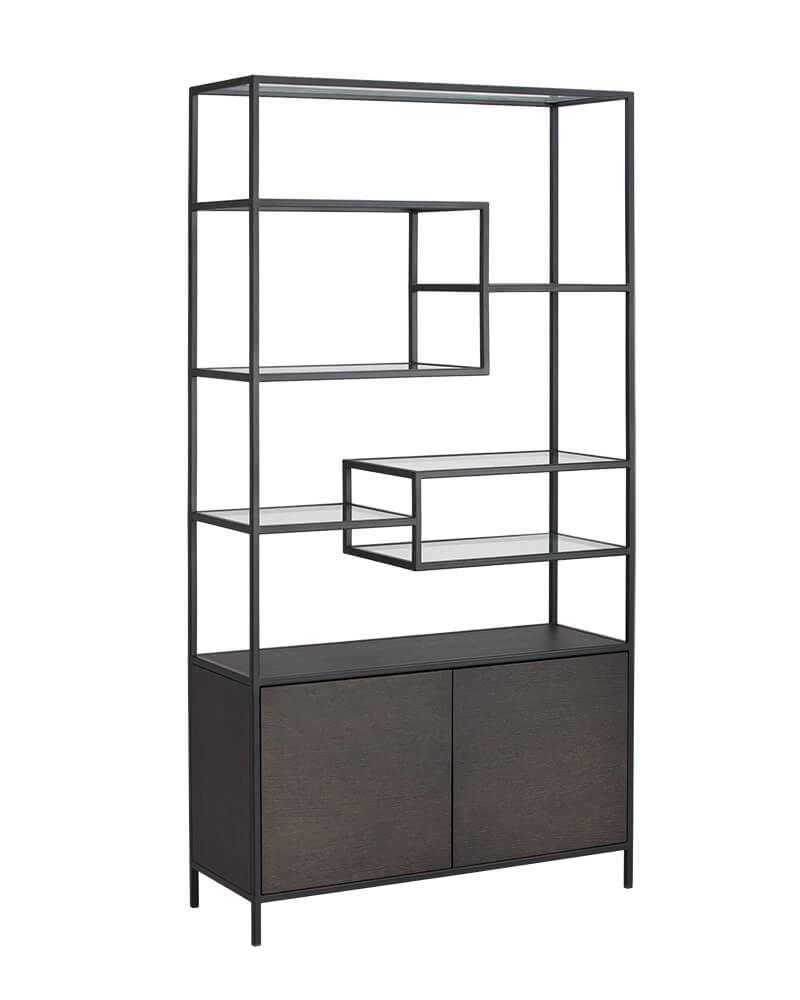A trifecta of materials comes together in this modern bookcase. Crafted in Indonesia, the base features charcoal grey oak wood with a surrounding black iron frame. Completed with sleek glass shelves and two cabinets for added style and function. Create a stylish living or office space by pairing with coordinating desk.
