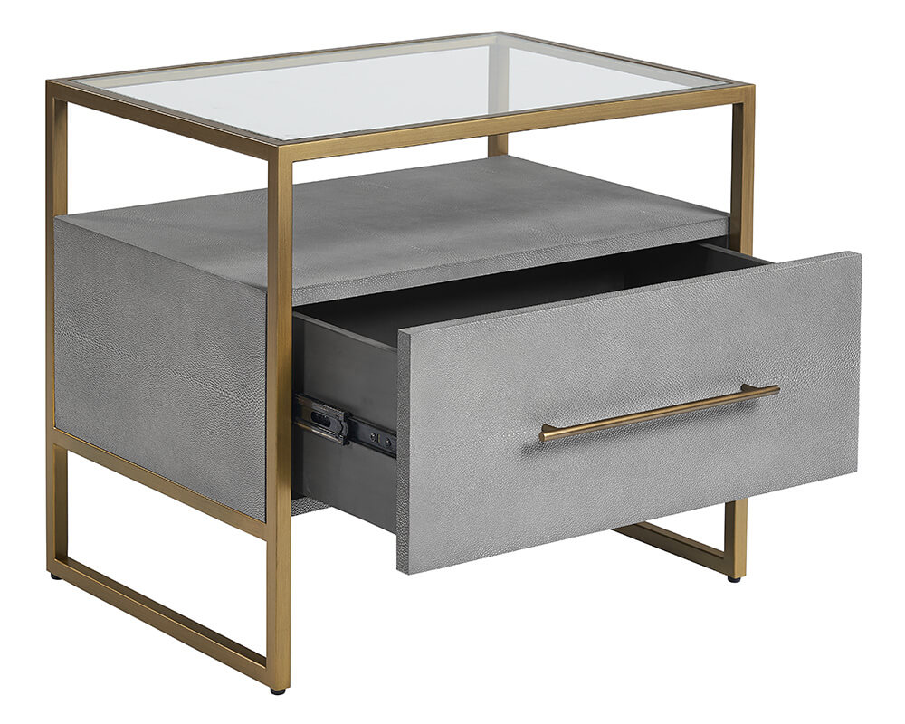 Defined by its clean and classic composition, this nightstand will bring glamour to any bedroom space it graces. Features a single drawer with an acacia wood veneer that is beautifully wrapped with our bonded grey shagreen leather. Completed with a clear tempered glass top and antique brass steel hardware. Coordinating dresser also available.
