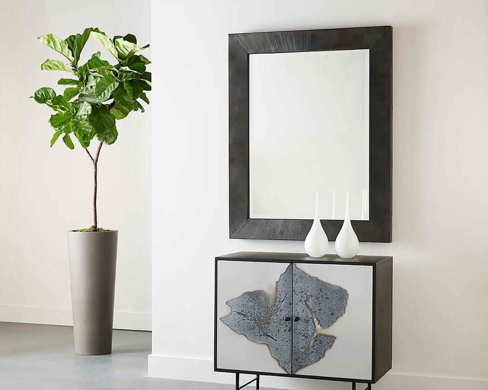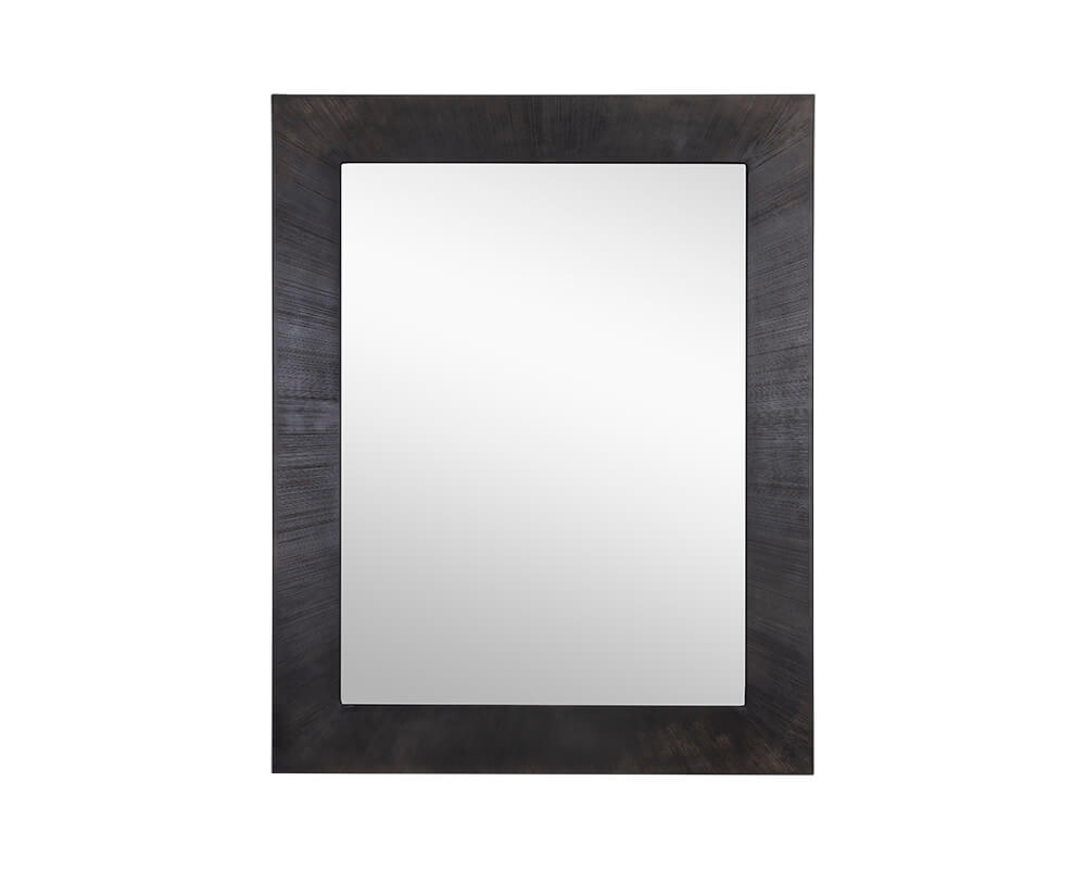 This contemporary wall mirror will add an intriguing sense of style to any living, loft or bedroom space. The aluminum frame features a gunmetal finish with a starburst pattern paired with a bevelled edge mirror. Coordinating floor mirror also available. Mounting and anti-tip kit included. Made in India. With refined craftsmanship, this design was brought to life by skilled local artisans. By nature, these materials develop unique imperfections such as fissures, markings and colour variations for a truly one-of-a-kind piece.