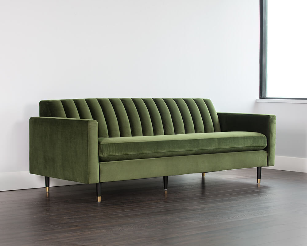 This structured sofa will make a bold and comfortable statement in any space. Features a seatback with channel tufting in velvet moss green or smokescreen grey fabric. Finished with espresso wood legs and brushed antique brass caps.
