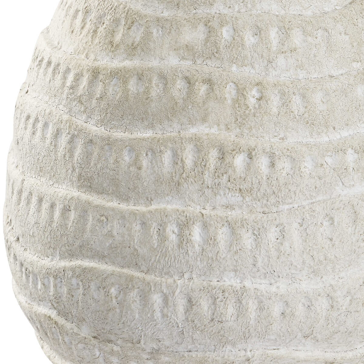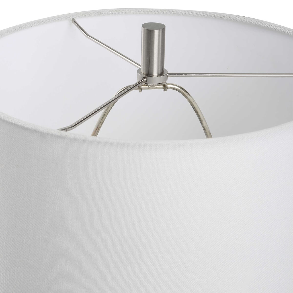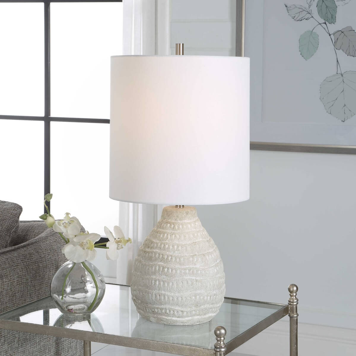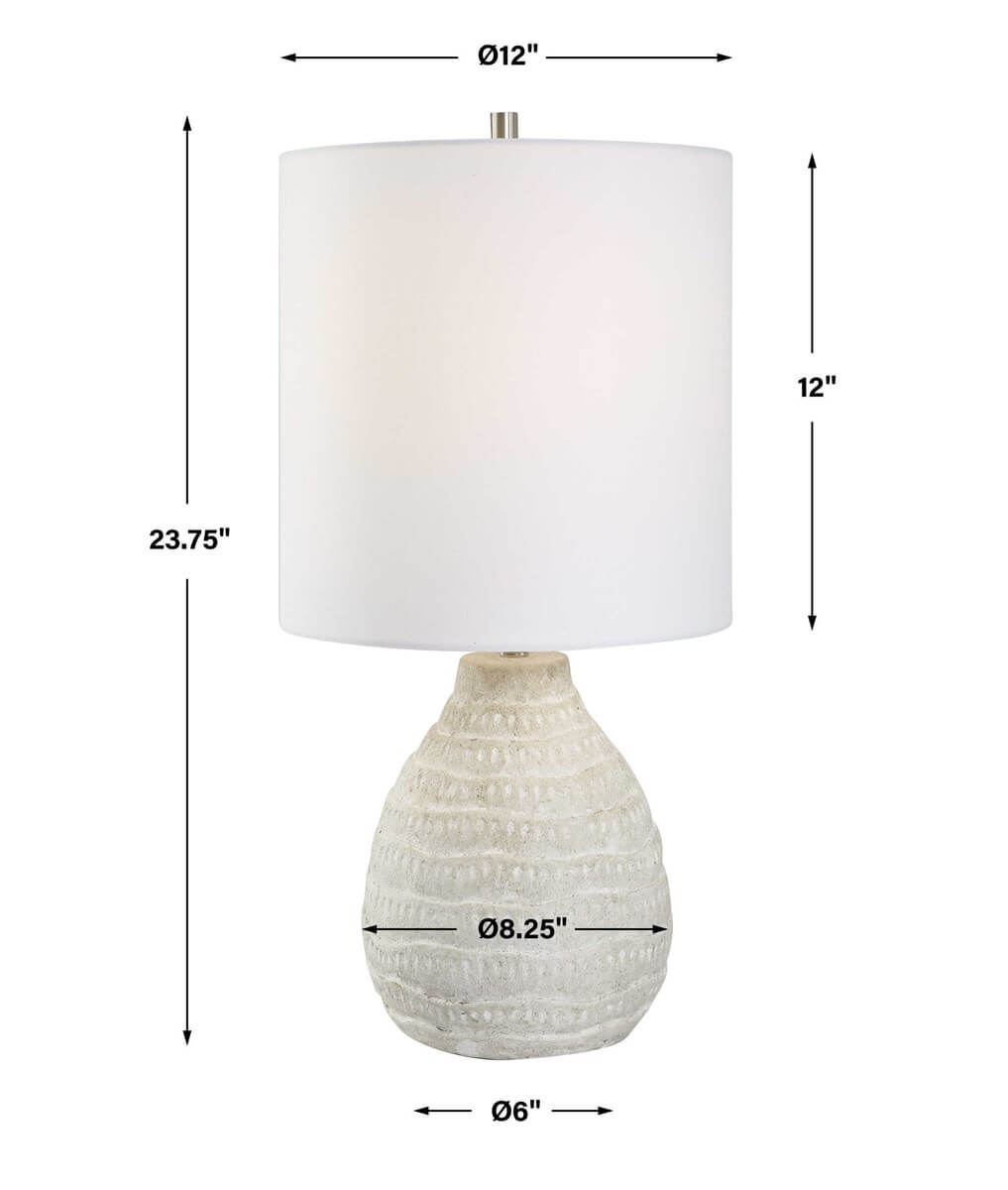 This organic shaped porcelain ceramic table lamp has a textured body, finished in an antique white wash, with brushed nickel accents. The drum hardback shade, with rolled edges, is an off white linen fabric.