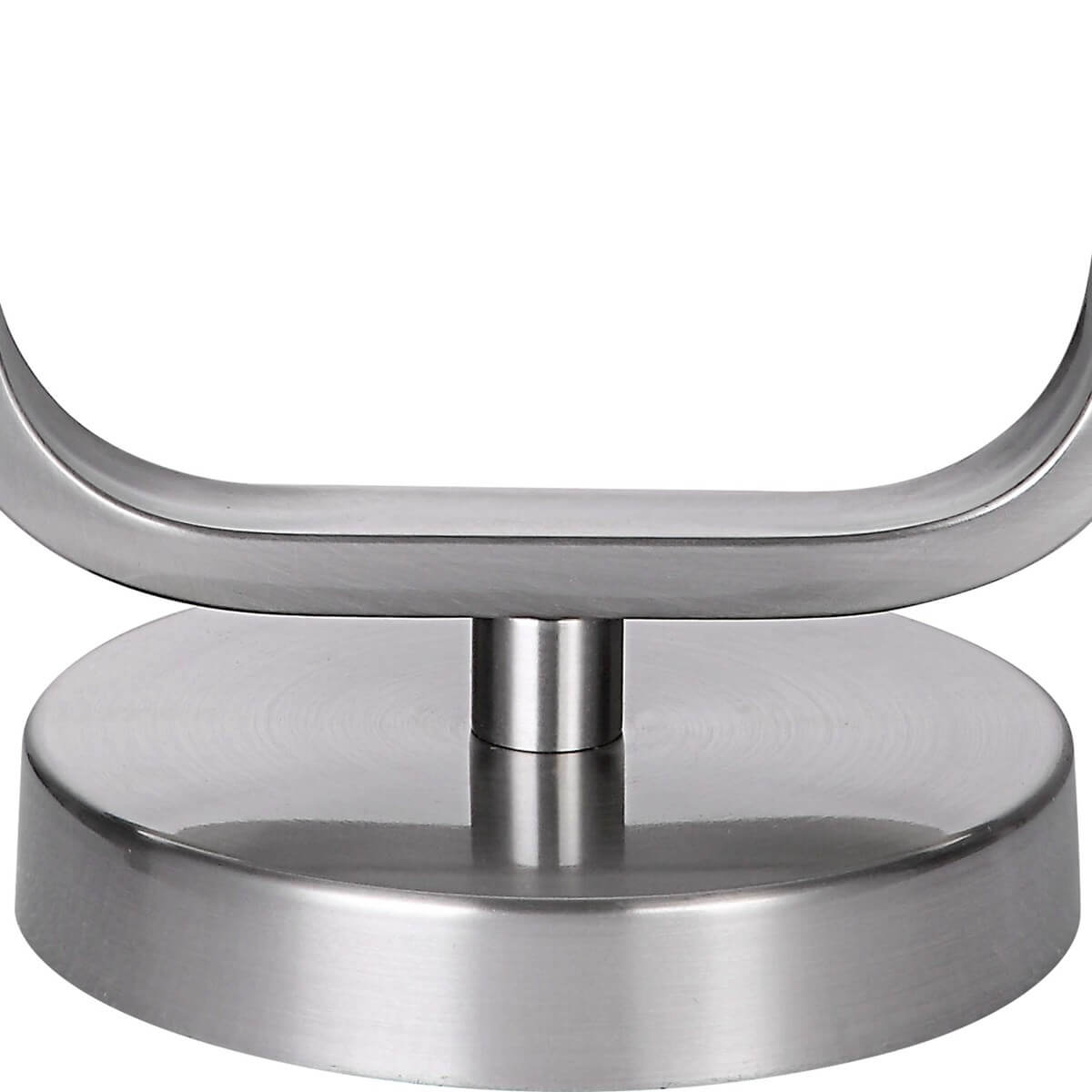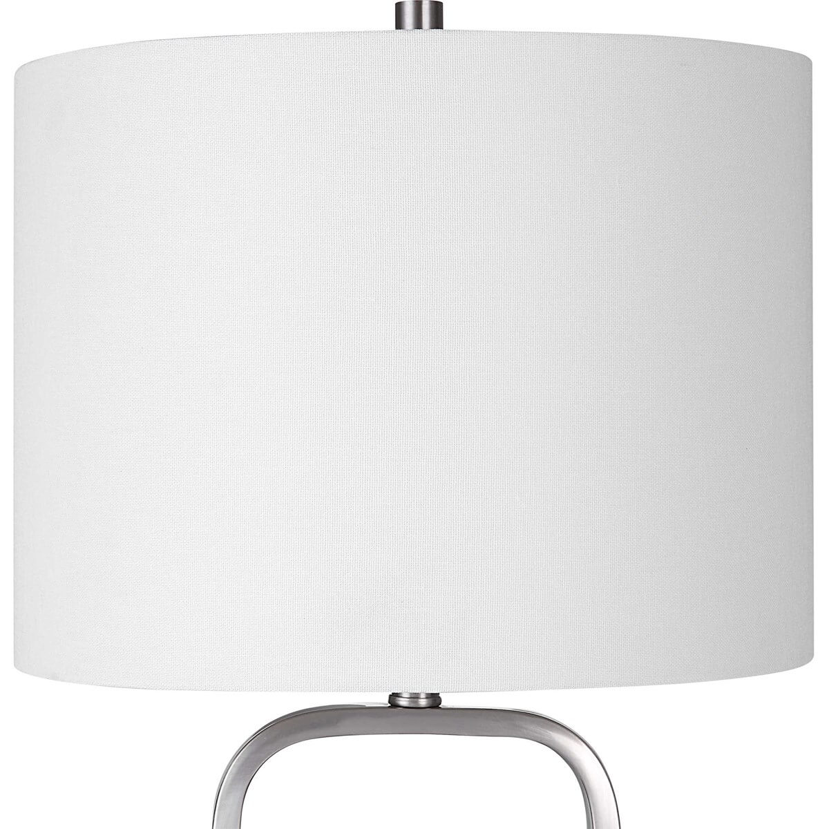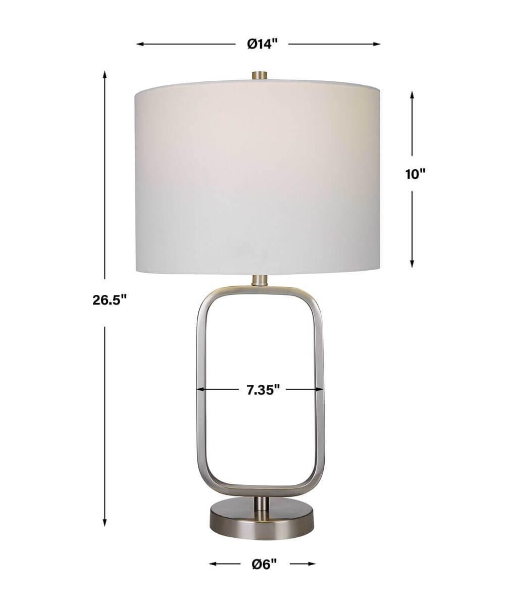 This unique table lamp features a clean rectangular metal base, accented with rounded corners, and finished in a brushed nickel. It is paired with a round hardback white linen shade.