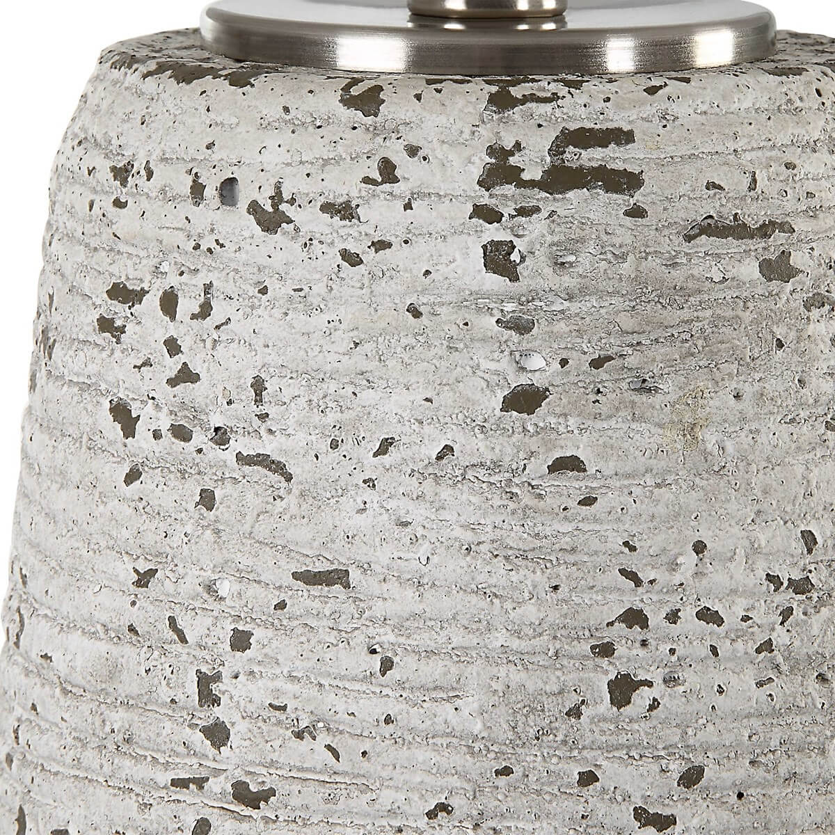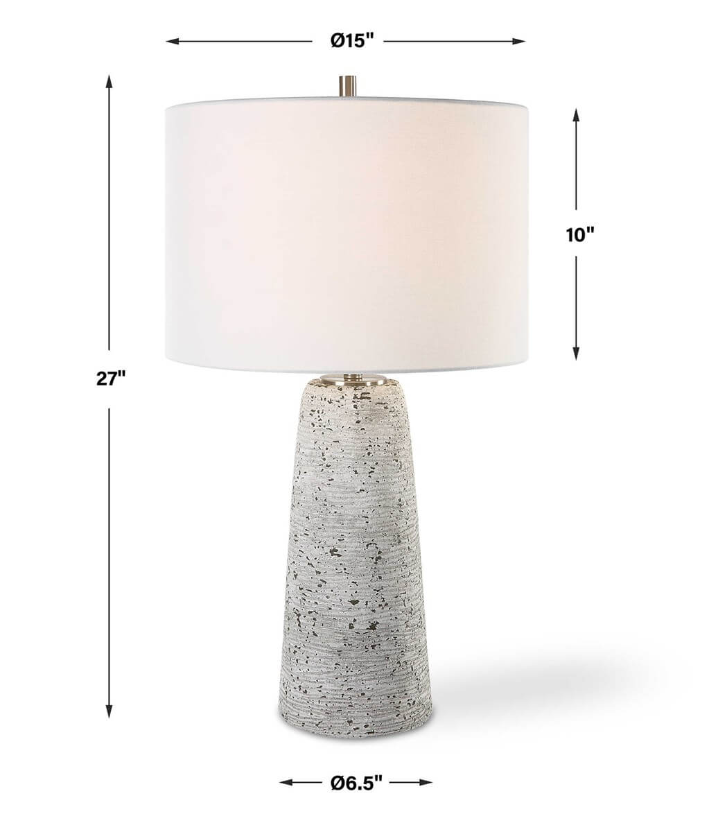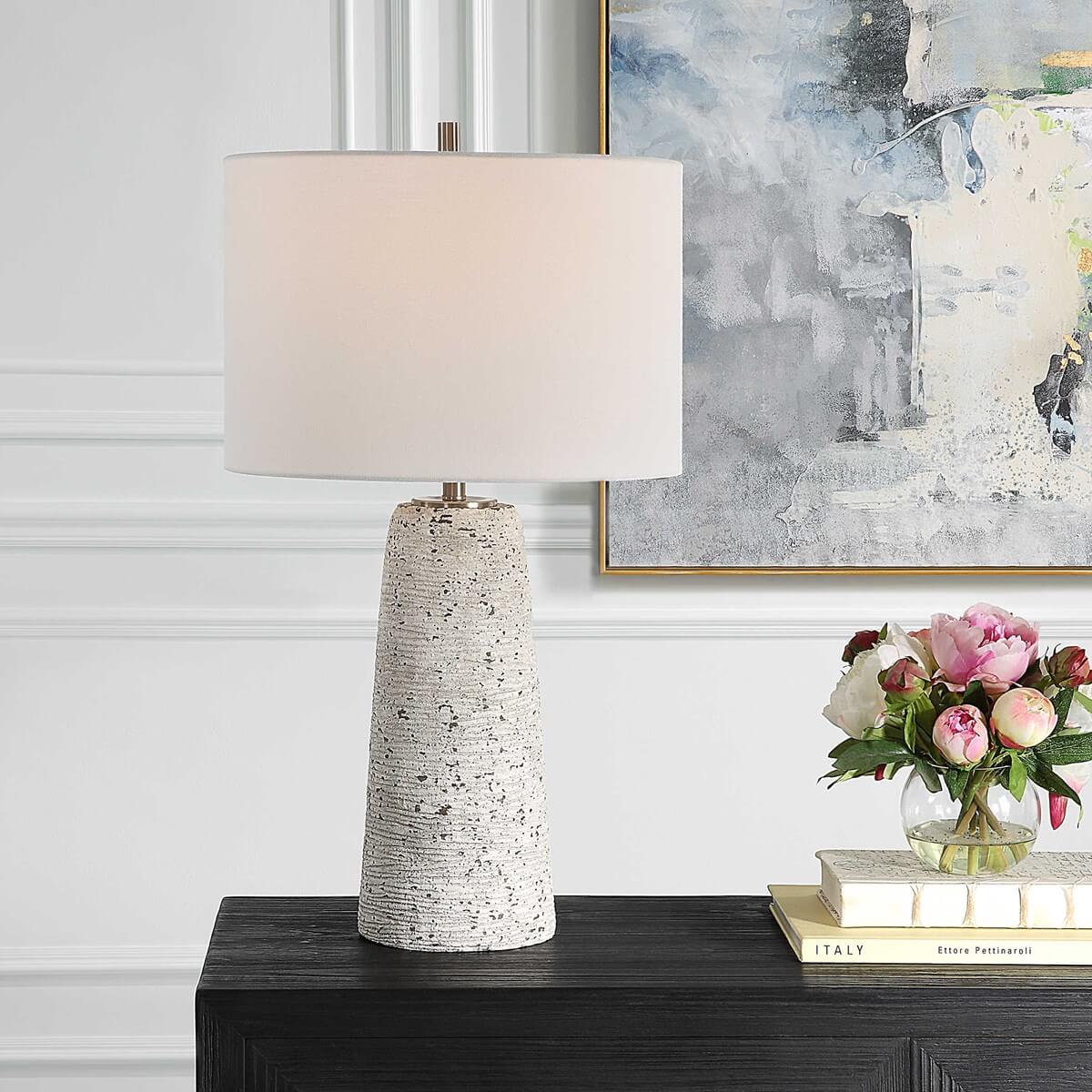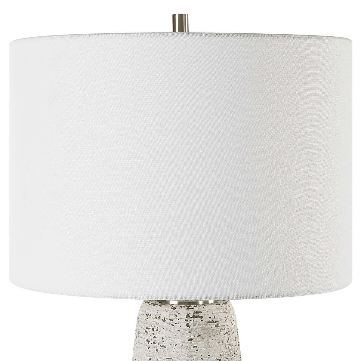 This tapered ceramic table lamp is finished in a heavily distressed, off white stone finish with aged gray undertones. Brushed nickel accents complement the finish. The drum hardback shade with rolled edges is a white linen fabric.