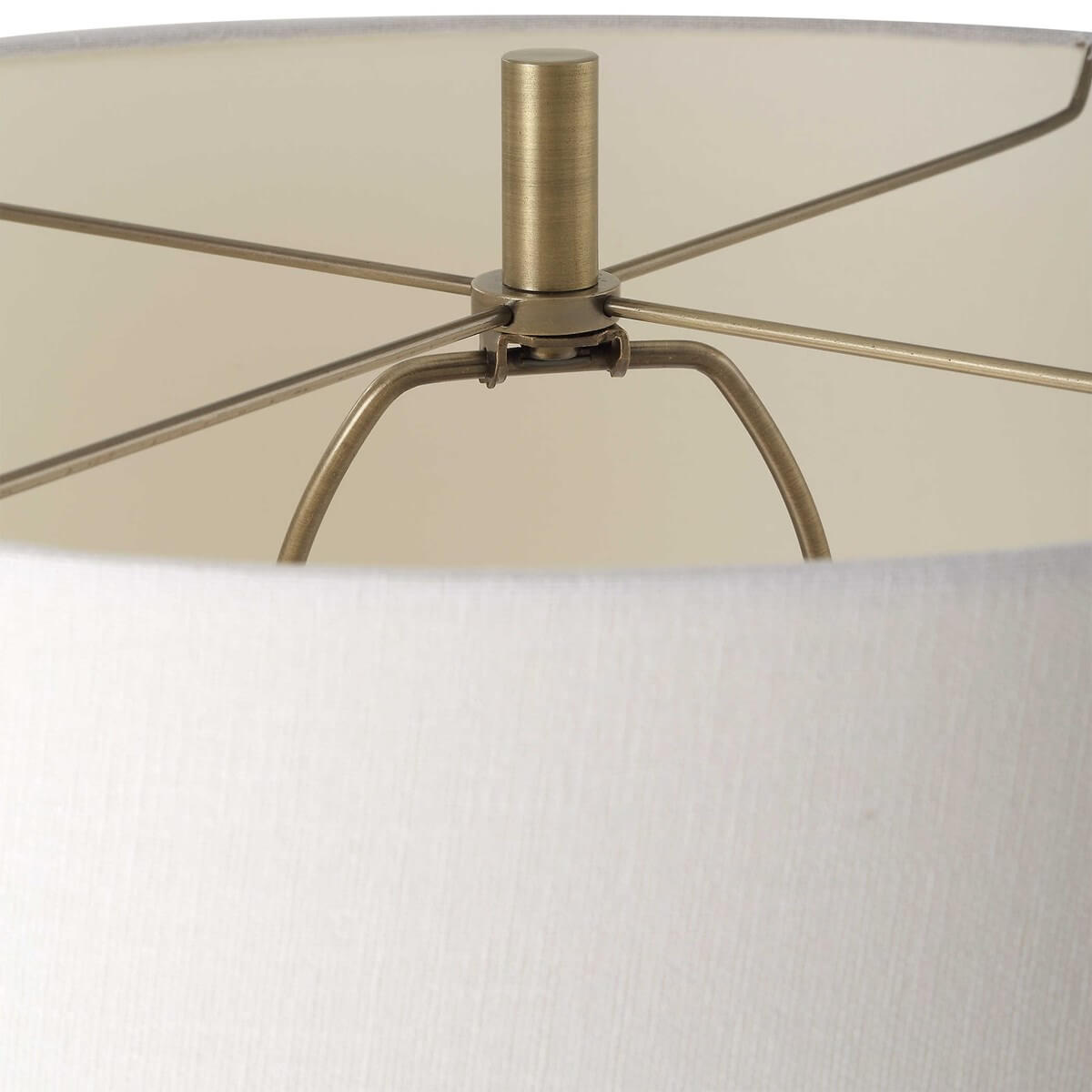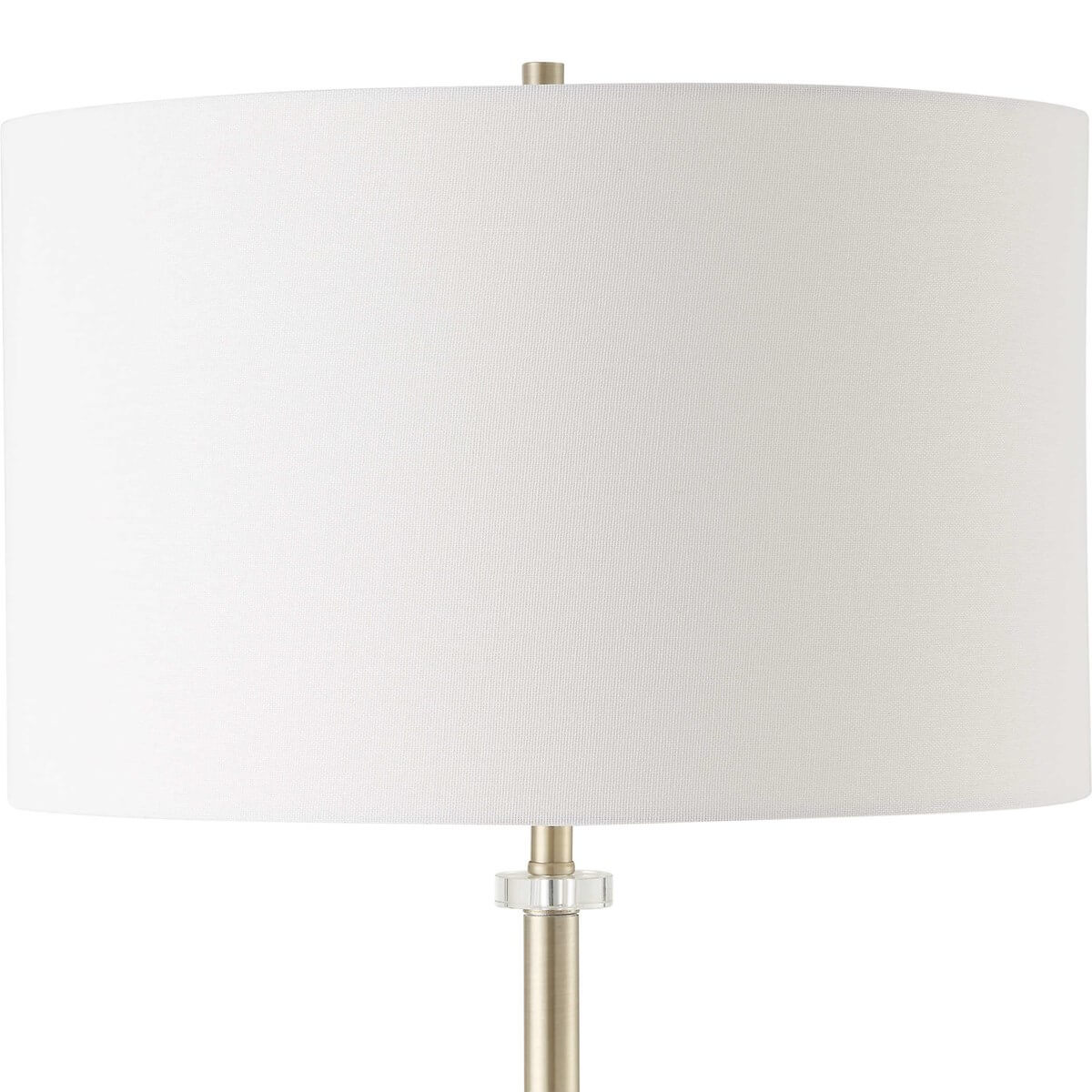 Designed with a slender body and finished in an antique brass, this floor lamp has a modern twist to its classic silhouette. While featuring a black tapered metal bottom, a piece of shimmering crystal adorns the top. The round shade is an off-white linen fabric. Also available in a table lamp