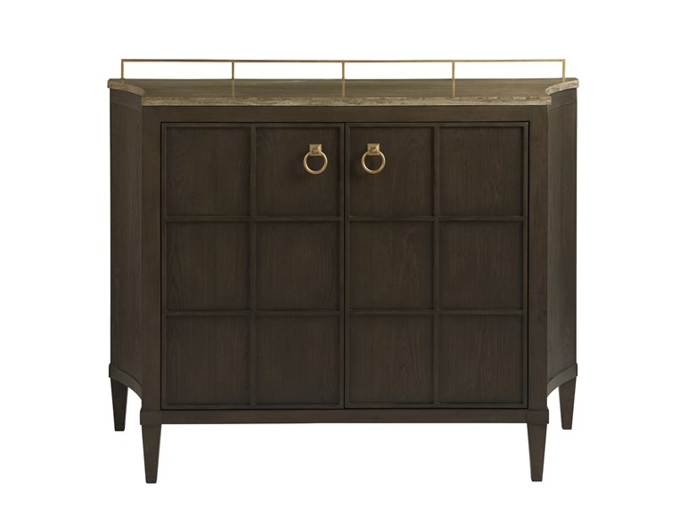The Soliloquy Bar Cabinet is rooted in timeless charm but built with a forward-thinking elegance, featuring a smooth stone top, a faintly textured Cocoa body, and abundant storage space for bottles, glasses, and other cocktail garnishes.