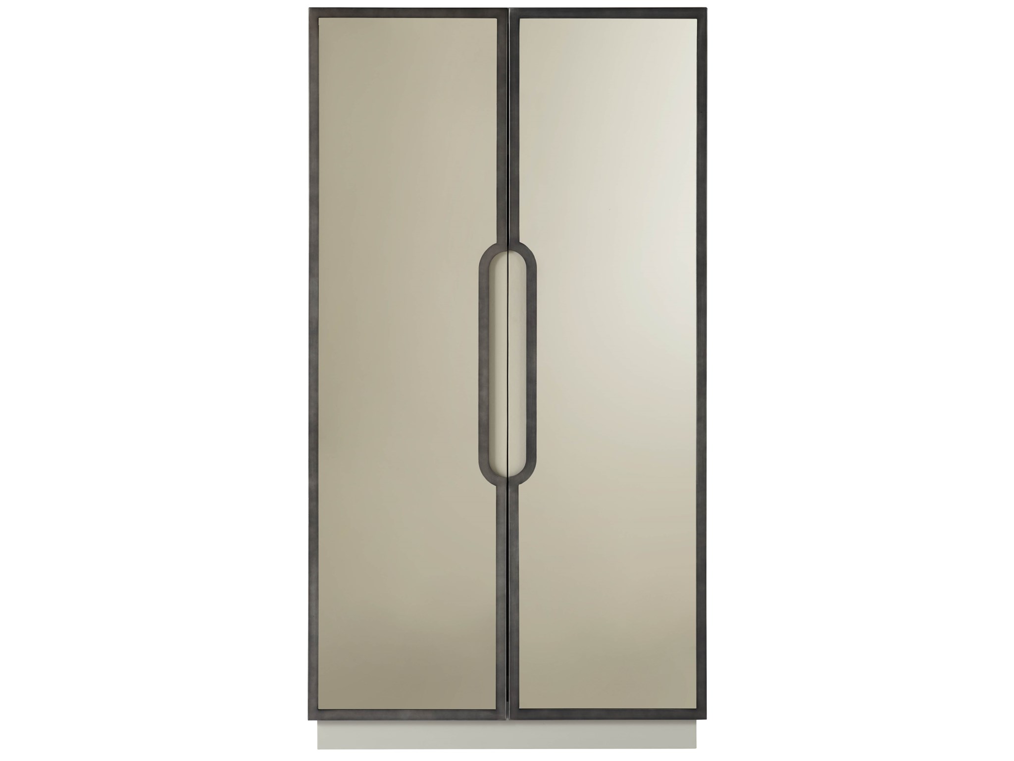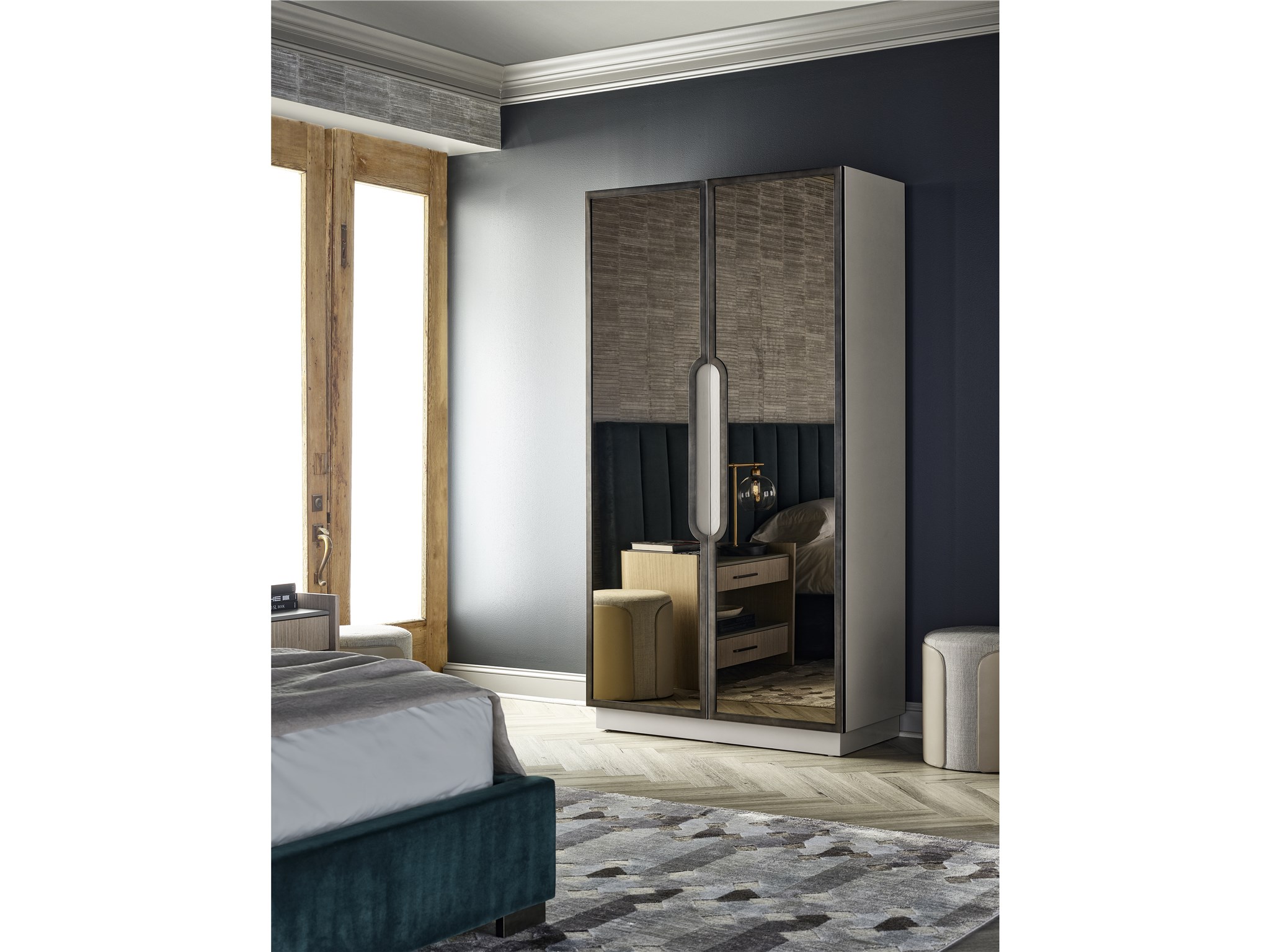 The Rembrandt Wardrobe captures modern appeal within a multi-functional frame, showcasing two doors with bronze mirror fronts, two adjustable shelves and six interior door drawers, all exquisitely accented by a Sand Lacquer finish.