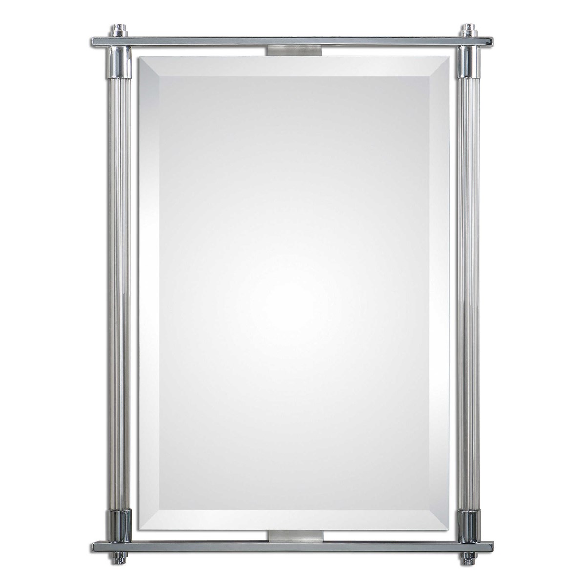 Ribbed glass columns accented with polished chrome plated details. Mirror features a generous 1 1/4" bevel. May be hung either horizontal or vertical.