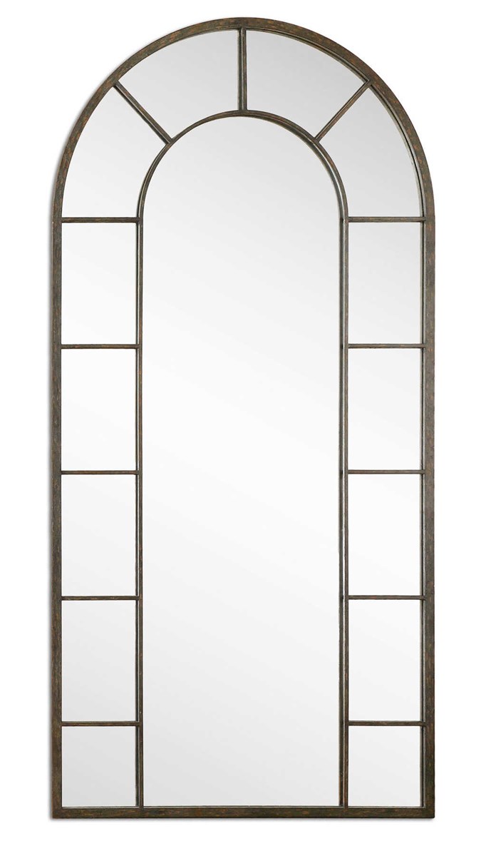 This stately, arched mirror features an aged black metal frame with light rust distressing.