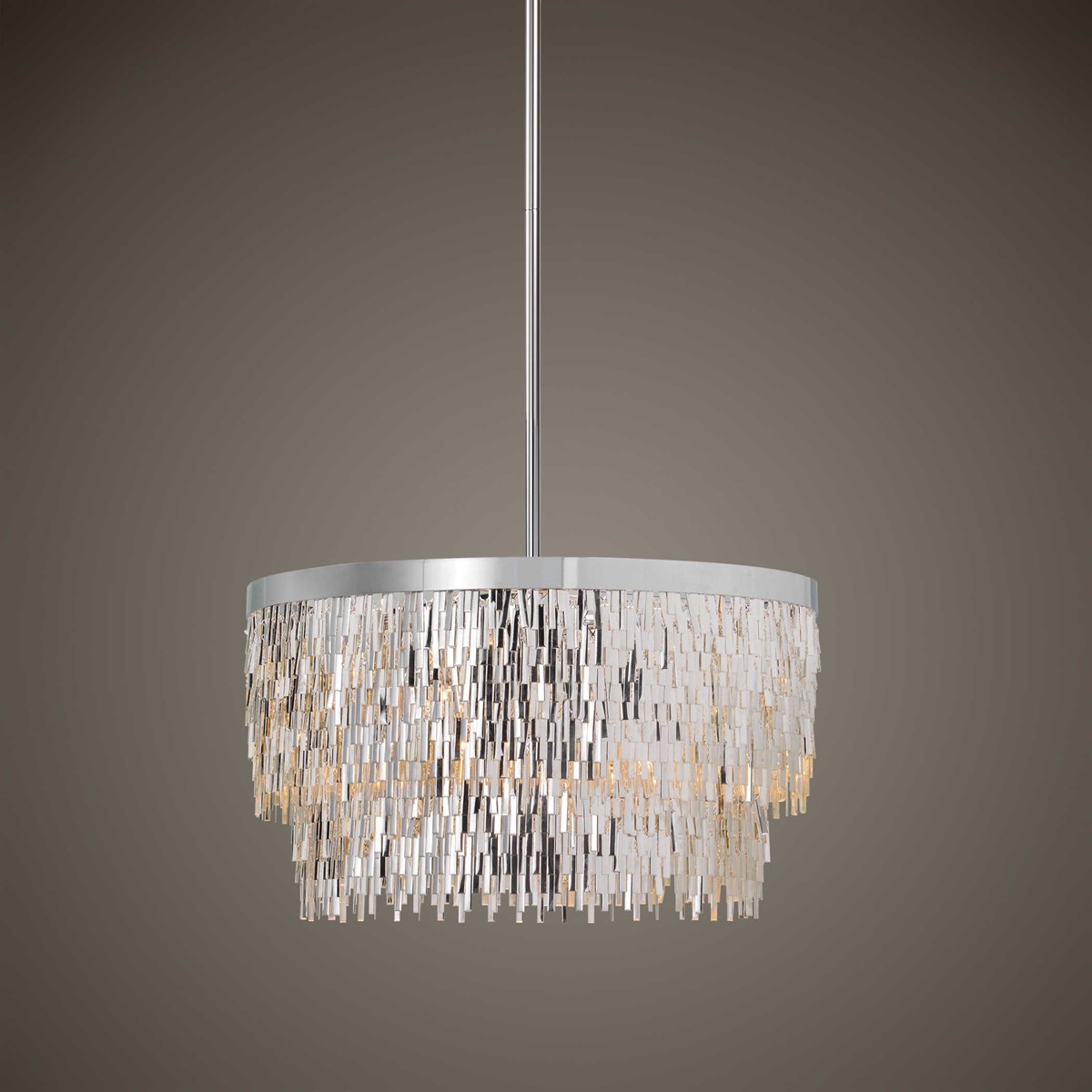 Chrome finish two tier chandelier pendant with tactile earring look shade, giving lots of sparkle and movement.