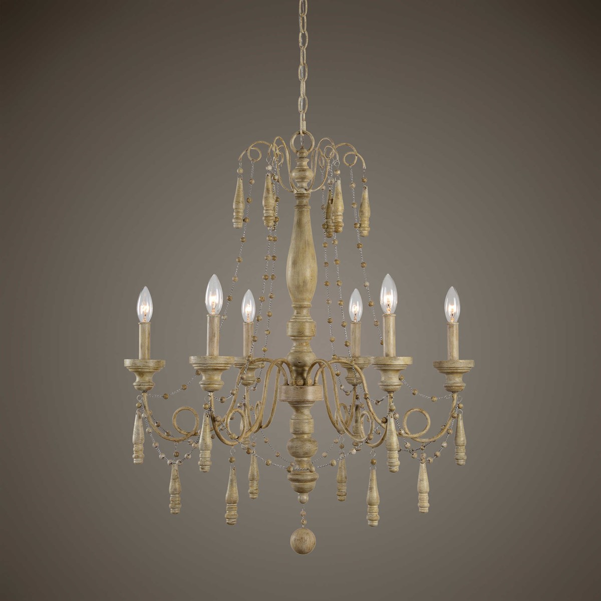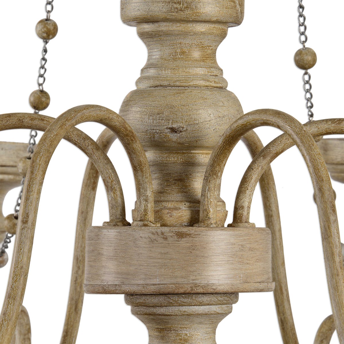 Transitional elegance is the best way to describe this turned wood detailed chandelier featuring a sea salt finish. The traditional chandelier roots show in the turned wood drops, wooden bobeches, and the wood beads threaded between washed nickel chains.