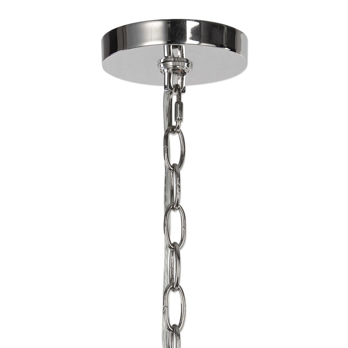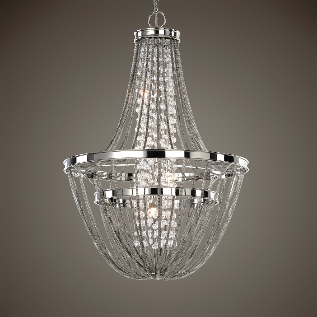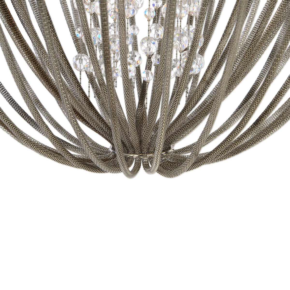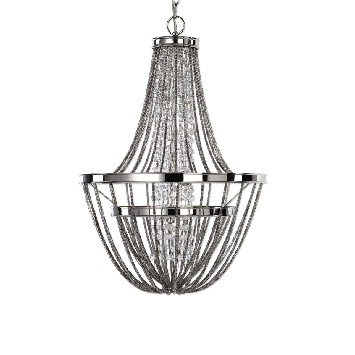 Transitional chandelier of polished nickel includes 4-40 watt G9 XENON bulbs. Accented with a center column of clear crystal strands, while featuring polished nickel finished mesh chain cascades flowing down the frame.
