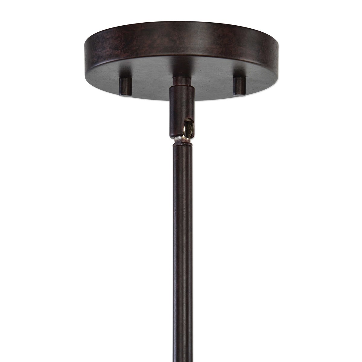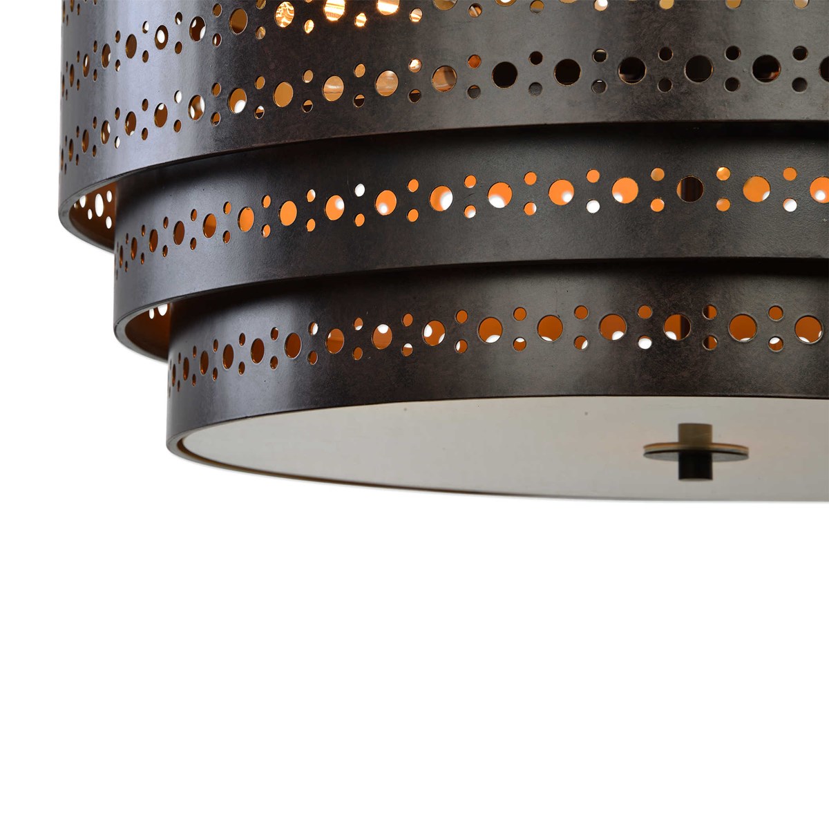 Transitional 3 Lt. rod hung chandelier. Featuring nested layers of circle punched pattern metal in a dark bronze finish. Includes 3-60 watt ST58 antique decorative style clear bulbs.