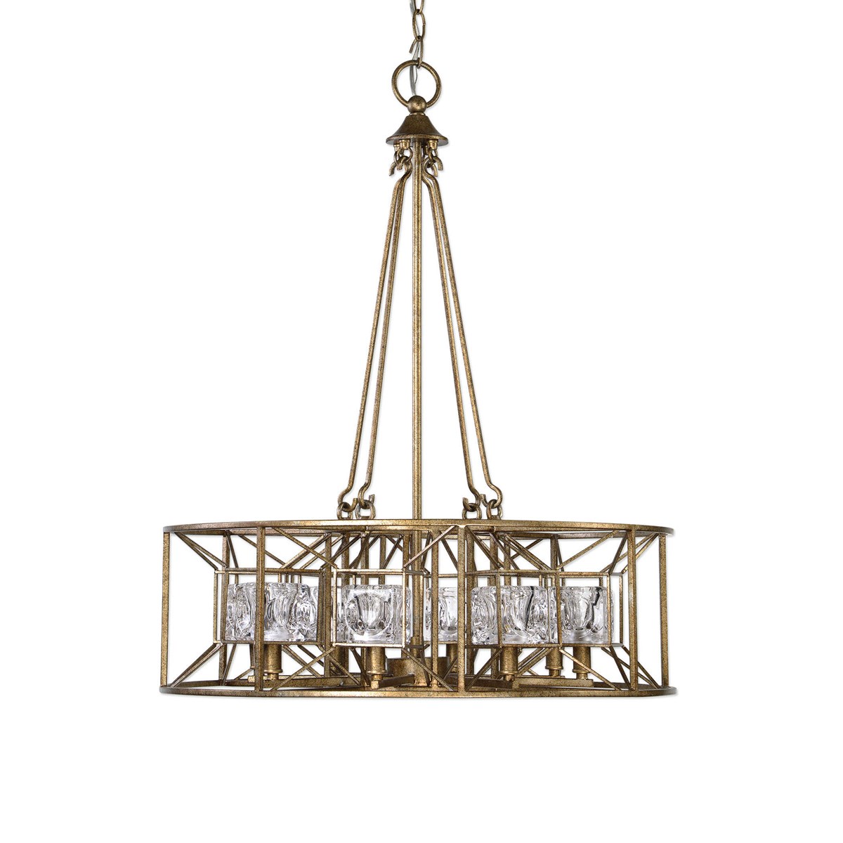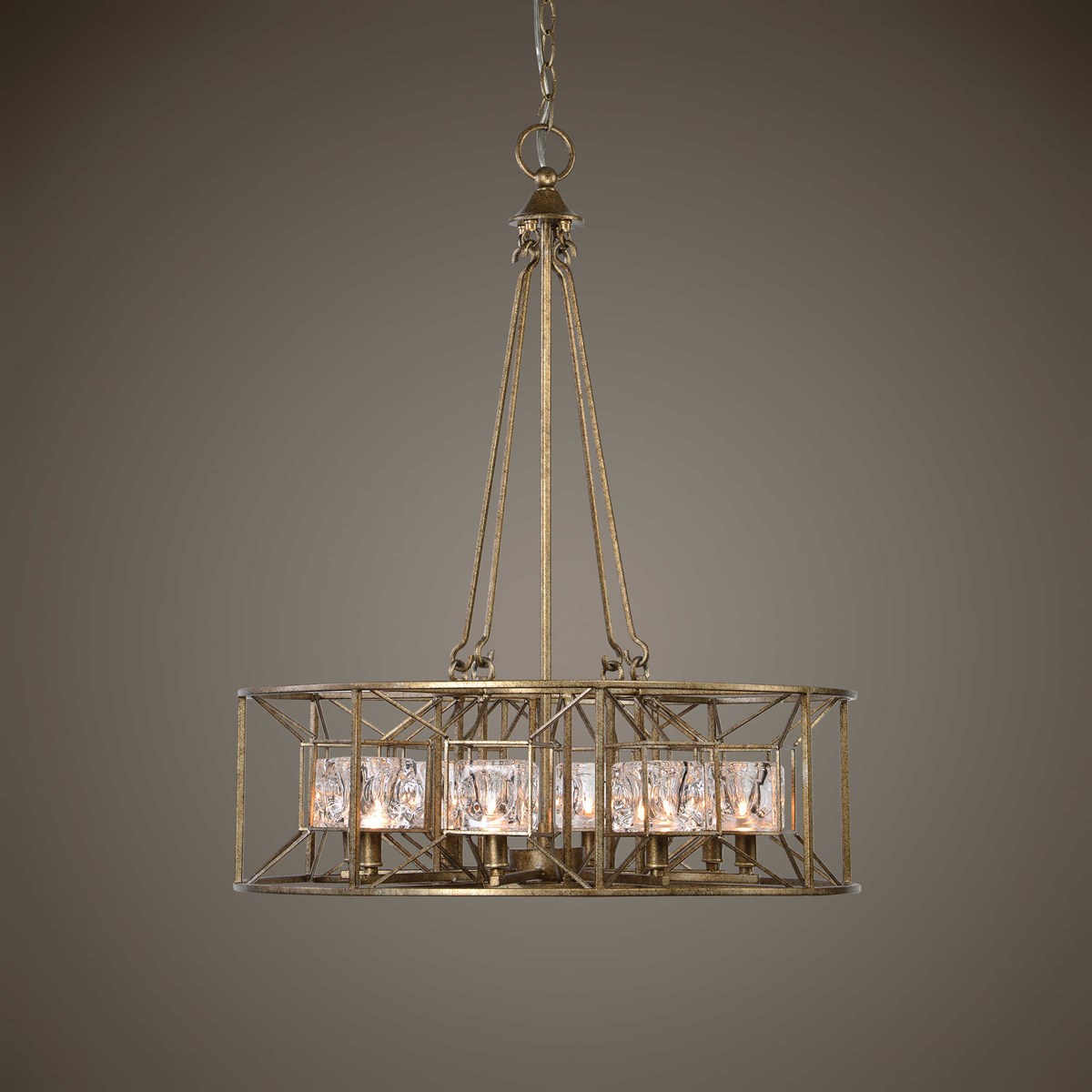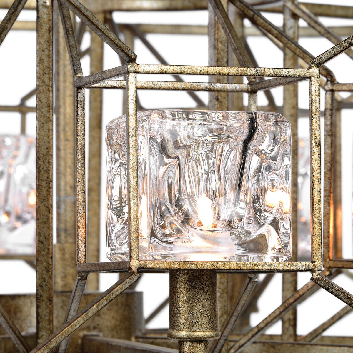 Clear glass cubes that have the feel of ice are the focus in this wonderful transitional 8 Lt. pendant, in a silver Swedish iron finish. The finish has a silver undertone with heavy dark antique distressing over it giving the rich Swedish iron overtone. 8-40watt G9 halogen bulbs are included.