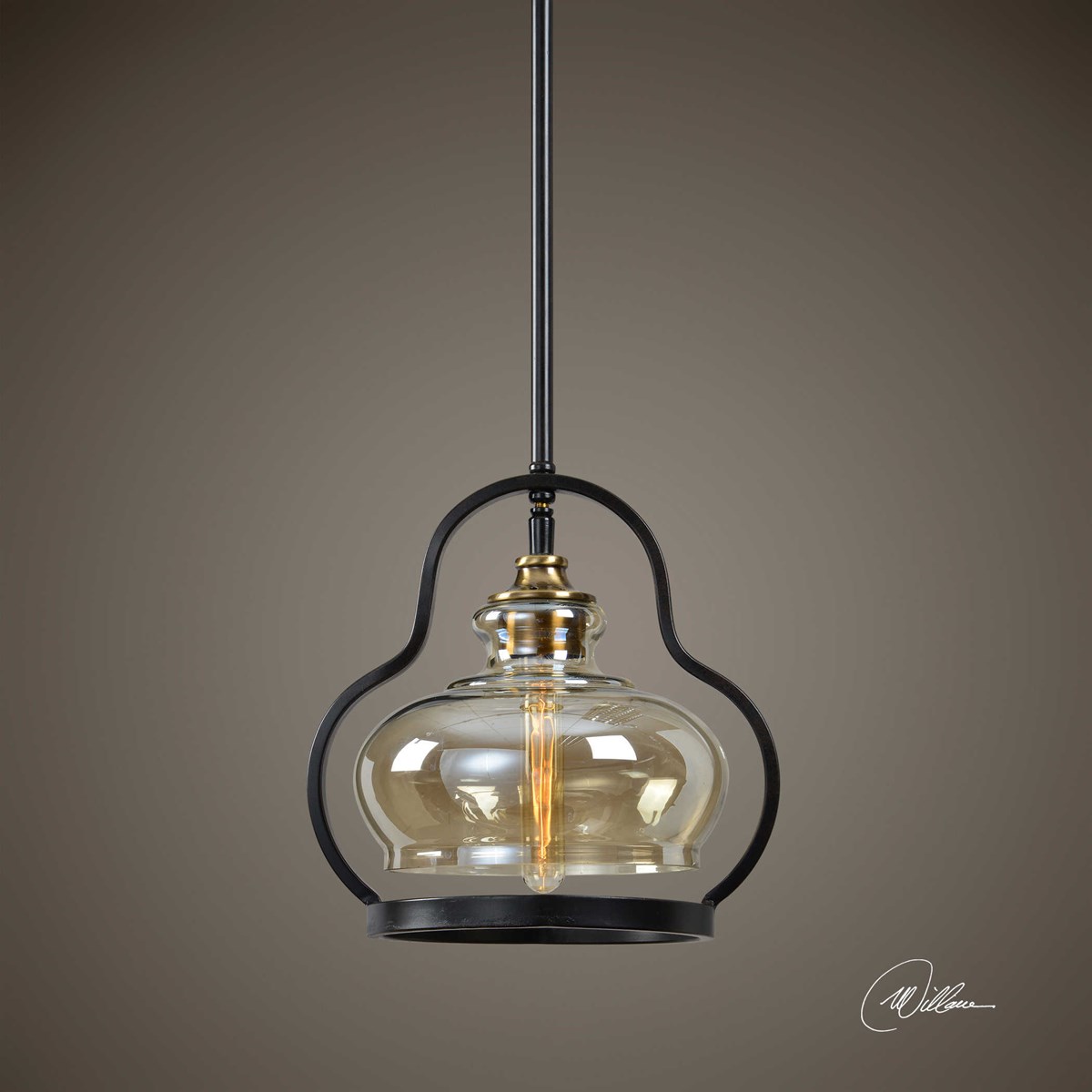 Updated mini pendant with curvaceous accent tubing that follows the contour of the light amber glass shade. Rod hung in an aged black iron finish with antiqued brass plated details. Includes 1-100 watt Edison socket. Supplied with 15' wire, 3-12" stems and 1-6" stem for adjustable installation.