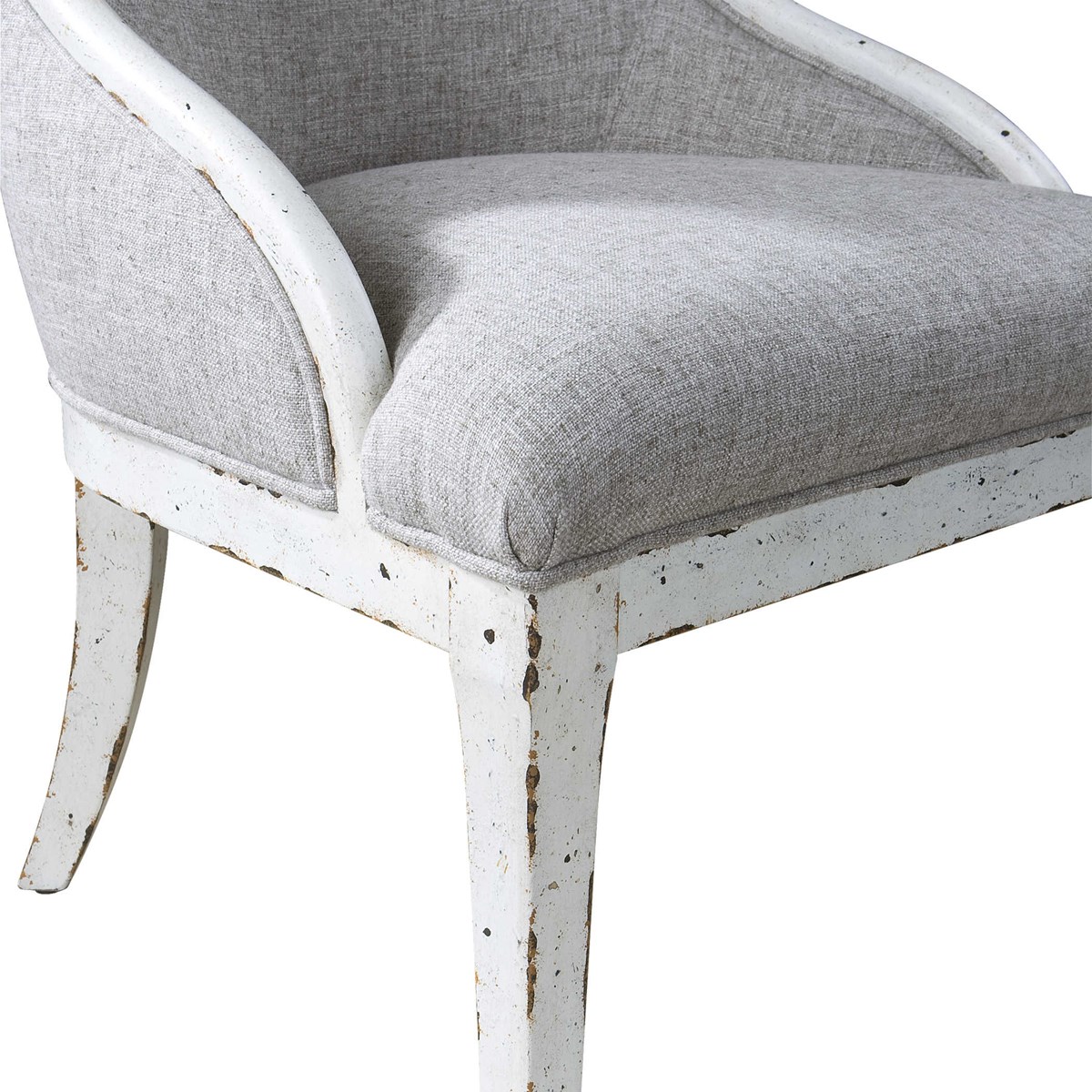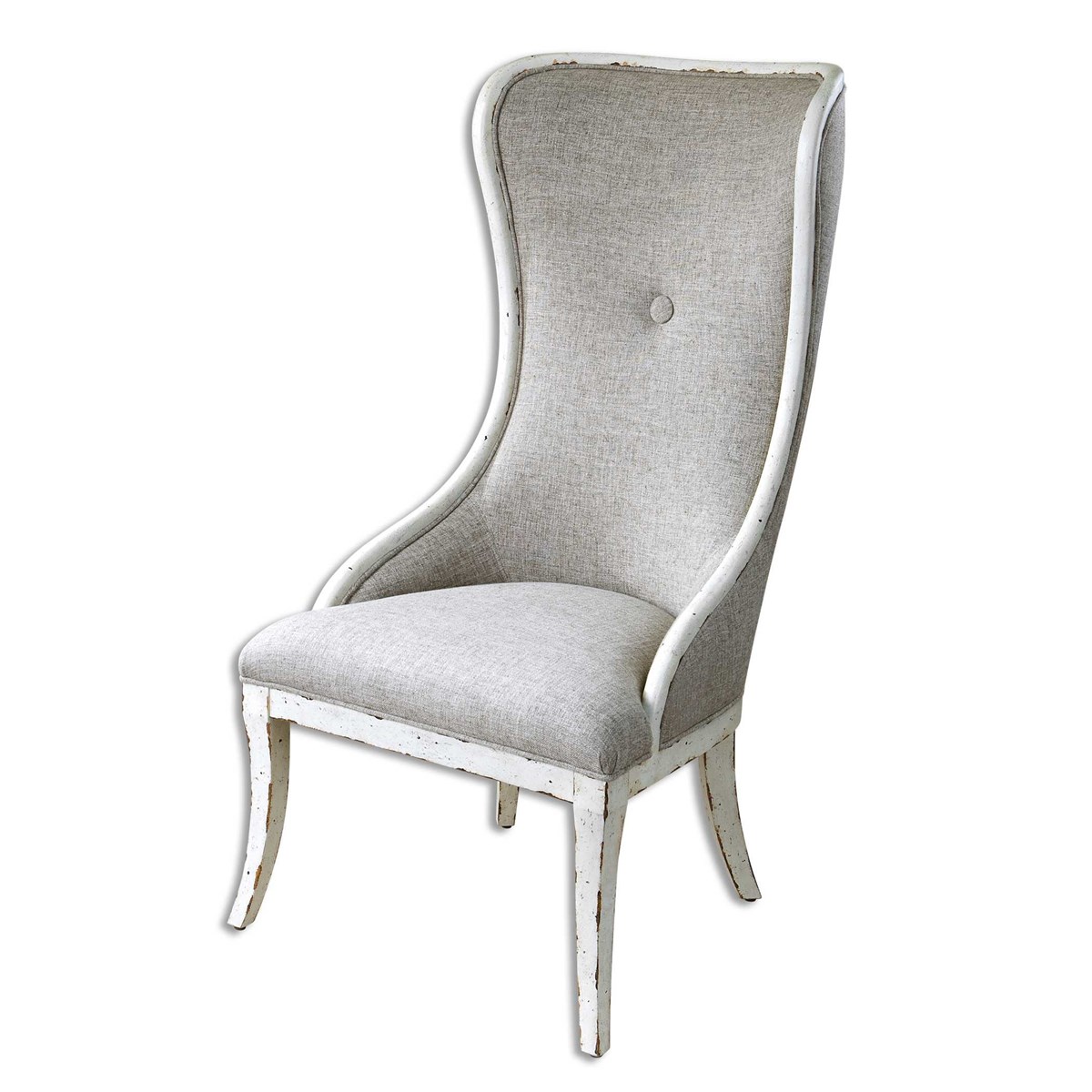 Exaggerated scale makes an impressive design statement in easy shades of flax linen and weathered white paint finish, solidly constructed in white poplar hardwood. Seat height is 19".