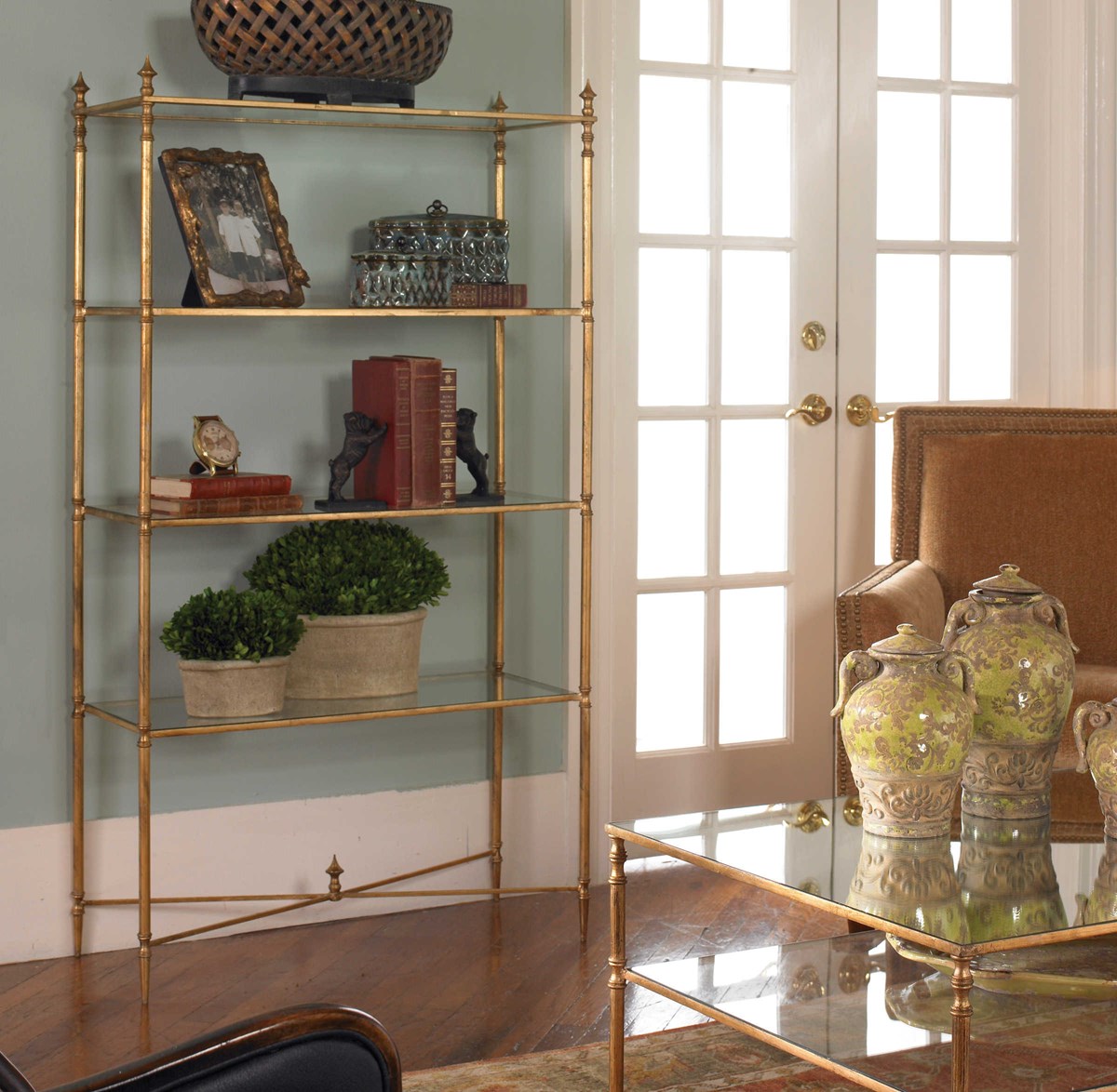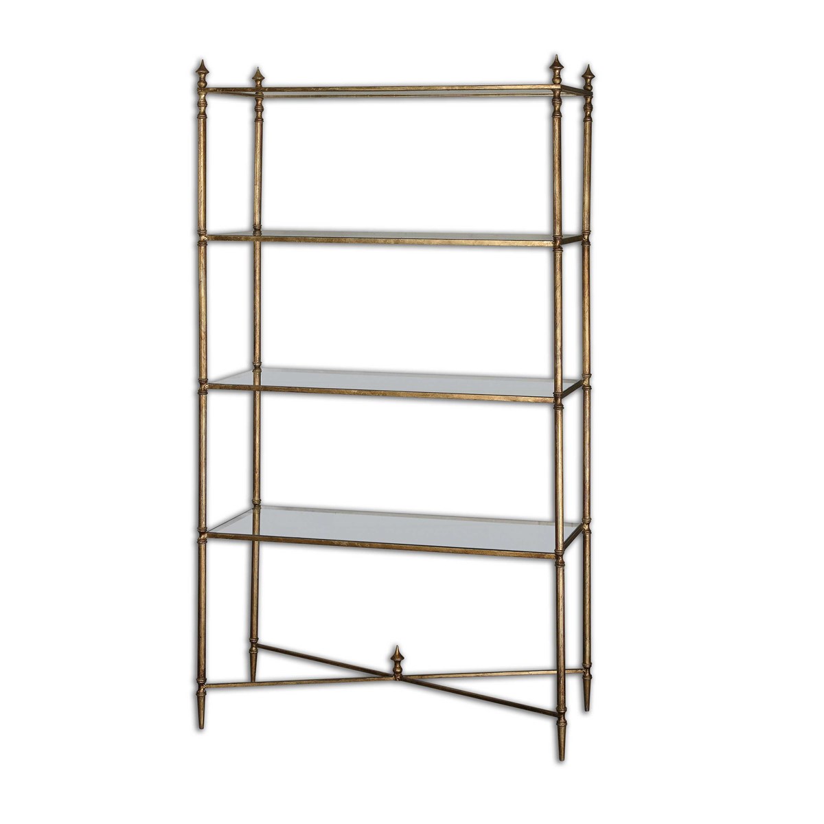 Forged iron frame finished all the way around in antiqued gold leaf and iron cross stretchers. Display shelves are clear, tempered glass.